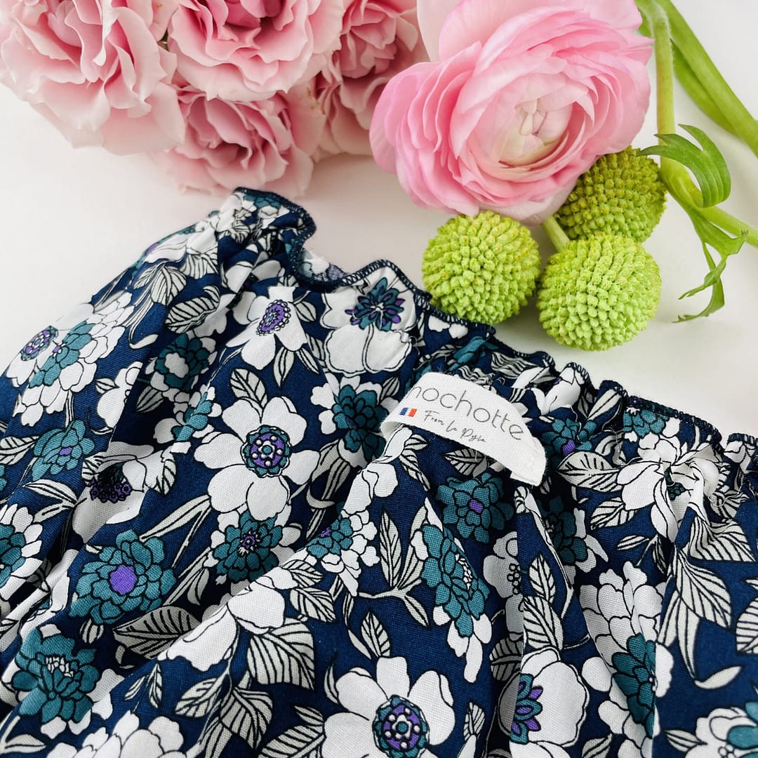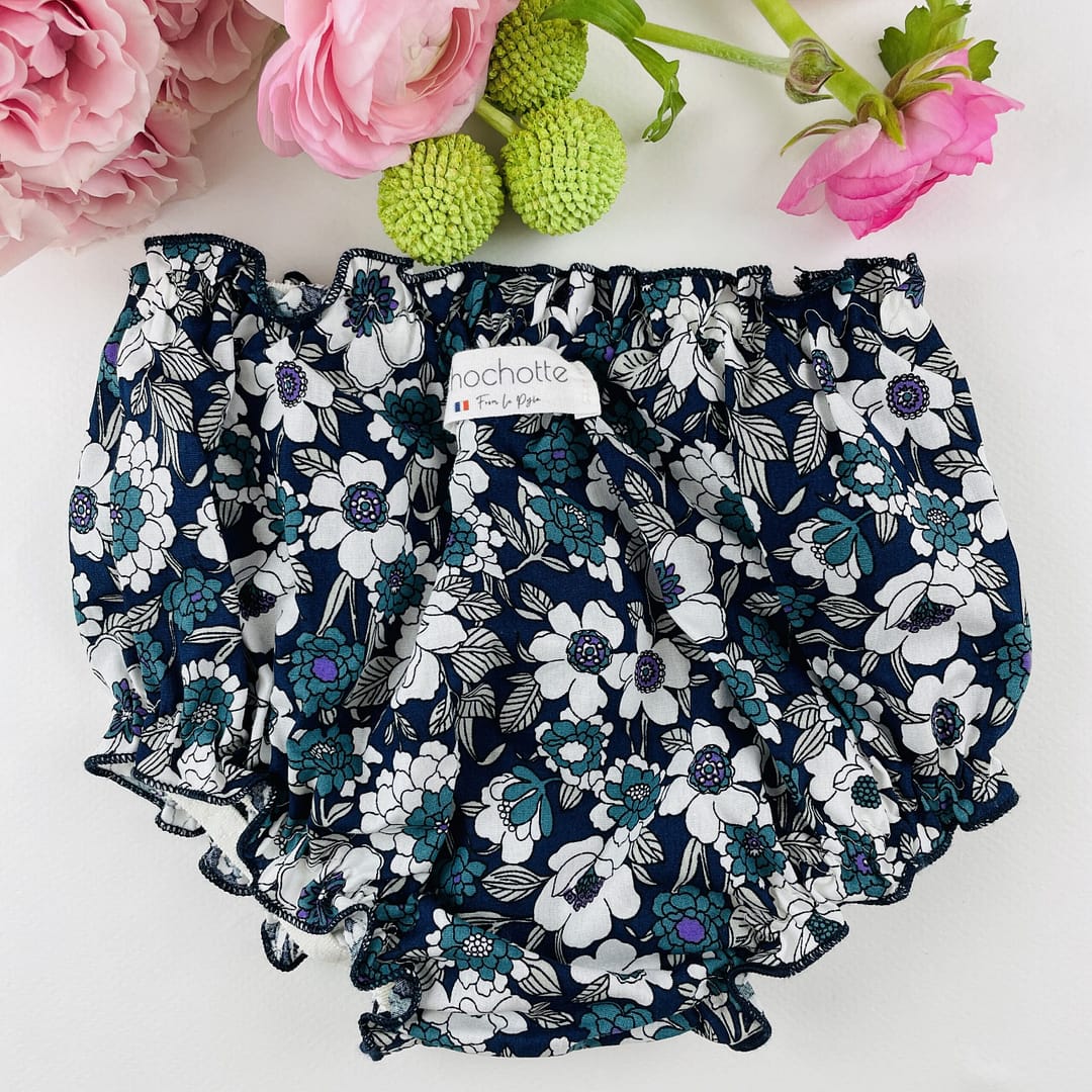 Bloomer pour bébé de 6 mois à 24 mois, taille unique. De jolis froufrous, 100% en voile de coton soyeux certifié OEKO TEX et GOTS, 100% made in France, 100%  fait main avec amour. Le bloomer Manon a un imprimé floral multicolore vintage dans les tons bleus, rehaussé d’un joli noeud fushia! Il s’agit d’une édition limitée. Existe également en version femme avec un modèle brésilien et culotte classique, ainsi qu’une jolie blouse babydoll.