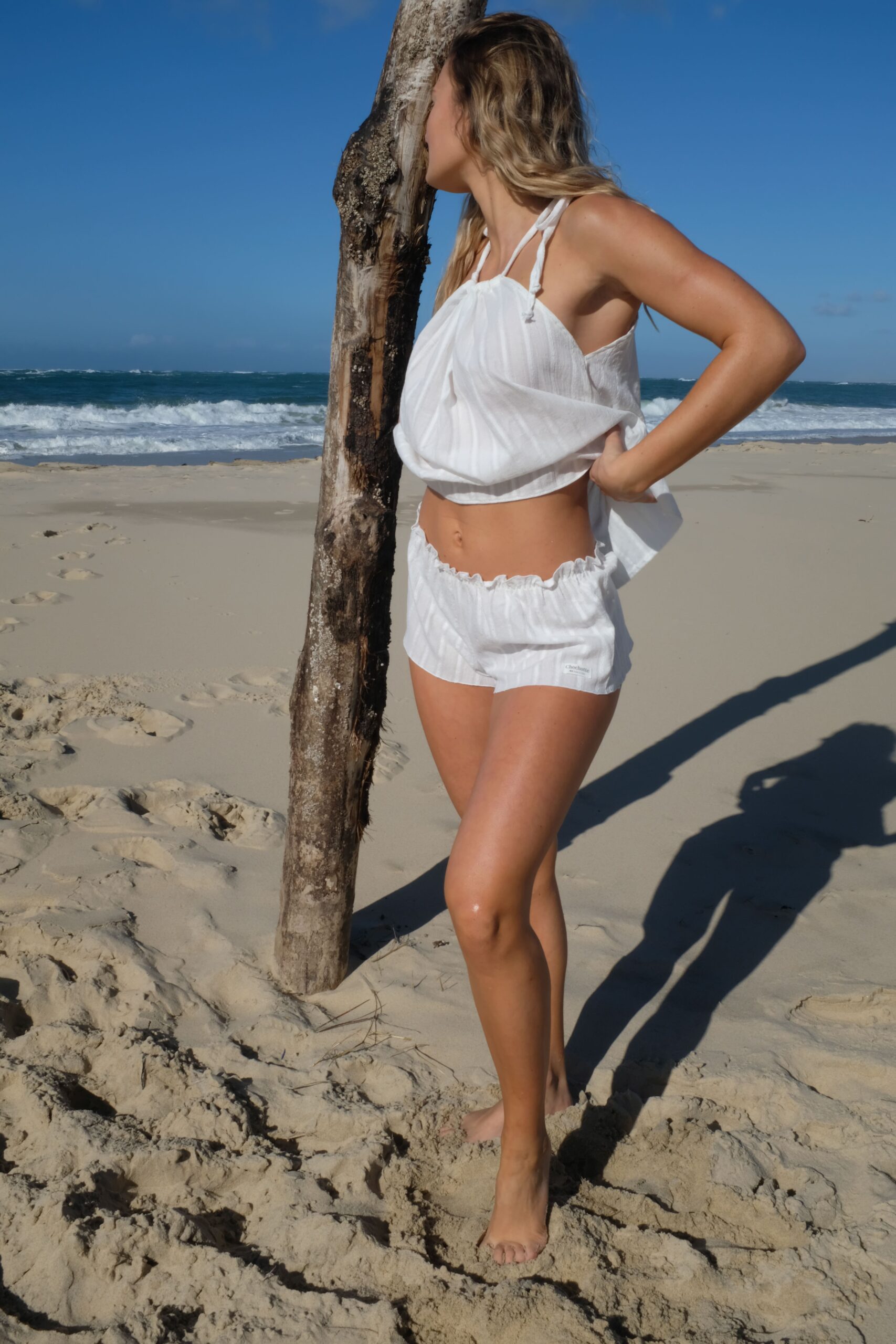 Blouse babydoll et son shorty de la série « Romance ». L’ensemble est 100% en voile de coton soyeux, 100% made in France, 100%  fait main. Couleur blanc/ naturel avec de jolies broderies. La petite blouse Chochotte est une blouse babydoll, légère et bohème, à marier avec vos petites culottes Chochotte ou un jean, un short…. bref ce que bon vous semblera! Idéale pour l’été, elle est très agréable à porter et laissera le vent vous rafraichir. Vous pouvez l’ajuster à votre guise grâce aux petits liens à nouer sur les épaules. Coup de coeur assuré! Il s’agit d’une édition limitée.
