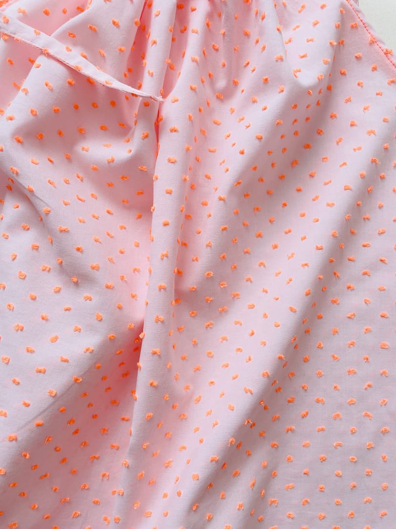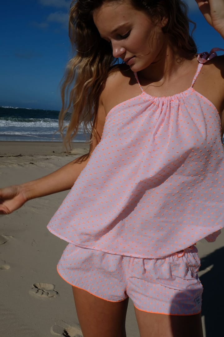 Blouse pour femme 100% en voile de coton soyeux à plumetis certifié BIO OKEO-TEX, 100% made in France, 100% fait main dans mon atelier sur le Bassin d’Arcachon. La petite blouse Bonbon est une blouse babydoll, légère et bohème, à marier avec vos petites culottes et/ ou shorty Chochotte la nuit ou avec un jean, un short en journée…. bref avec ce que bon vous semblera! Elle est ajustable grâce aux liens. Le col et le décolleté est également modulable selon vos envies. Elle est en plumetis orange fluo sur un fond rose pastel. Les surpiqures sont également orange fluo. Idéale pour l’été, elle est très agréable à porter et laissera le vent vous rafraichir. Coup de coeur assuré! Il s’agit d’une édition limitée.