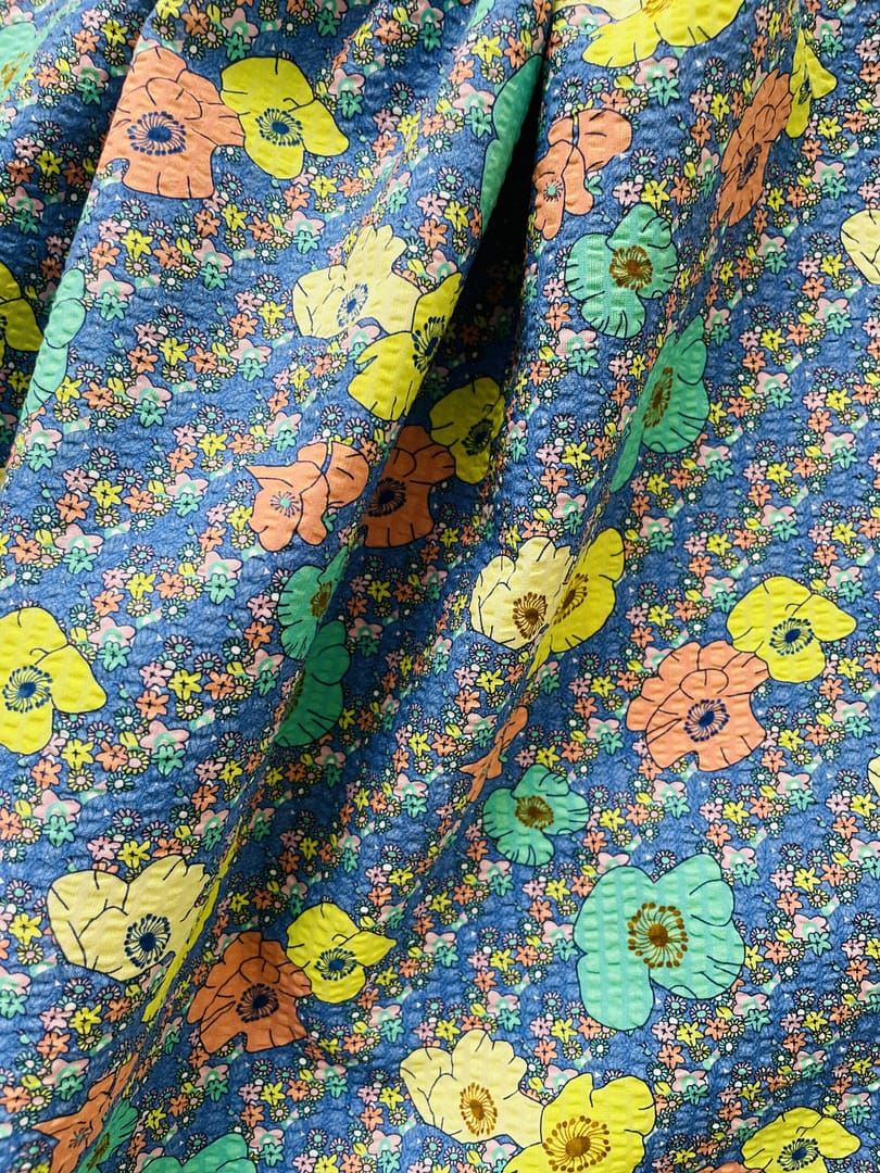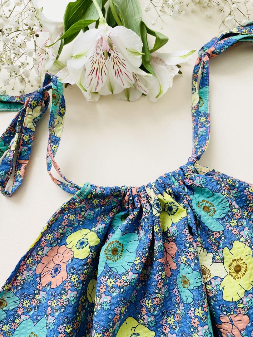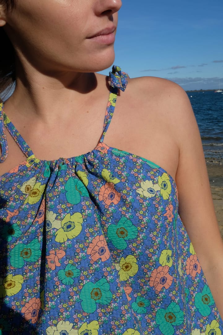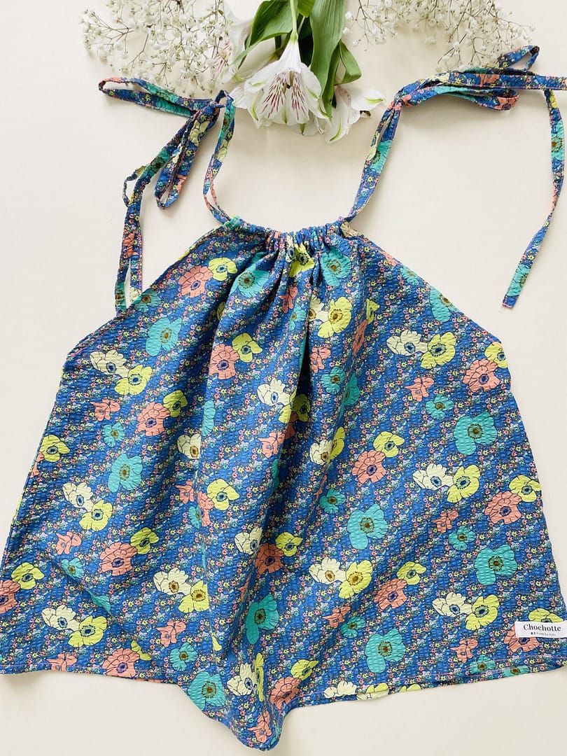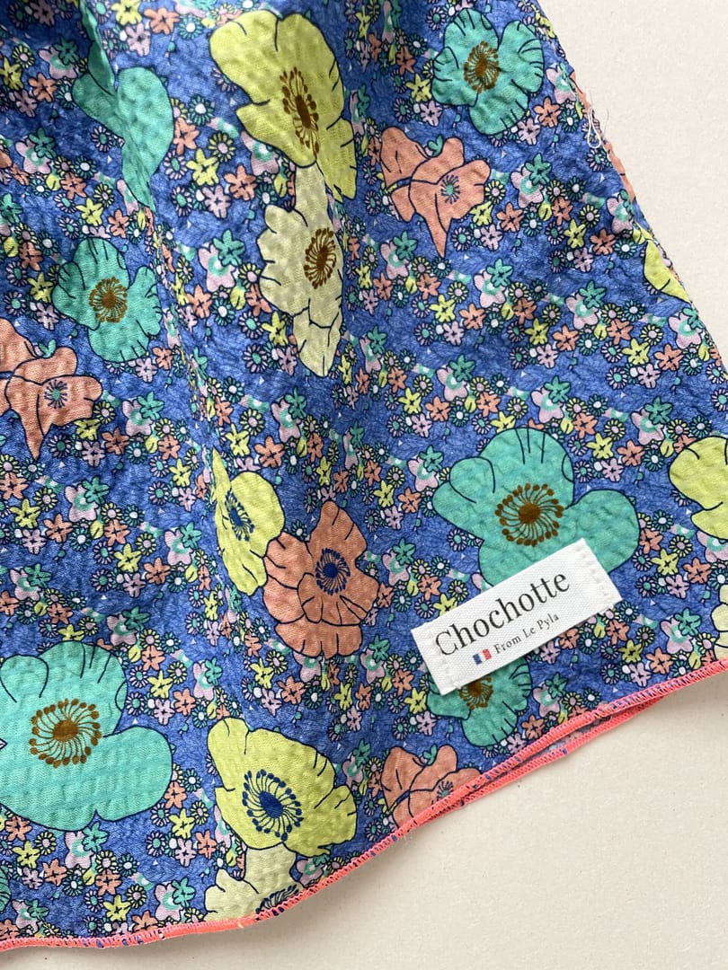 Blouse pour femme 100% coton seersucker, certifié BIO OKEO-TEX, 100% made in France, 100% confectionné par mes soins sur le Bassin d’Arcachon. La petite blouse Mado est une blouse babydoll, légère et bohème, à marier avec vos petites culottes et/ ou shorty Chochotte la nuit ou avec un jean, un short en journée…. bref avec ce que bon vous semblera! Elle est ajustable grâce aux liens. Le col et le décolleté est également modulable selon vos envies. Elle a un imprimé fleuri multicouleurs sur fond bleu, avec des surpiqûres corail. Idéale pour l’été, elle est très agréable à porter et laissera le vent vous rafraichir. Coup de coeur assuré! Il s’agit d’une édition limitée.
