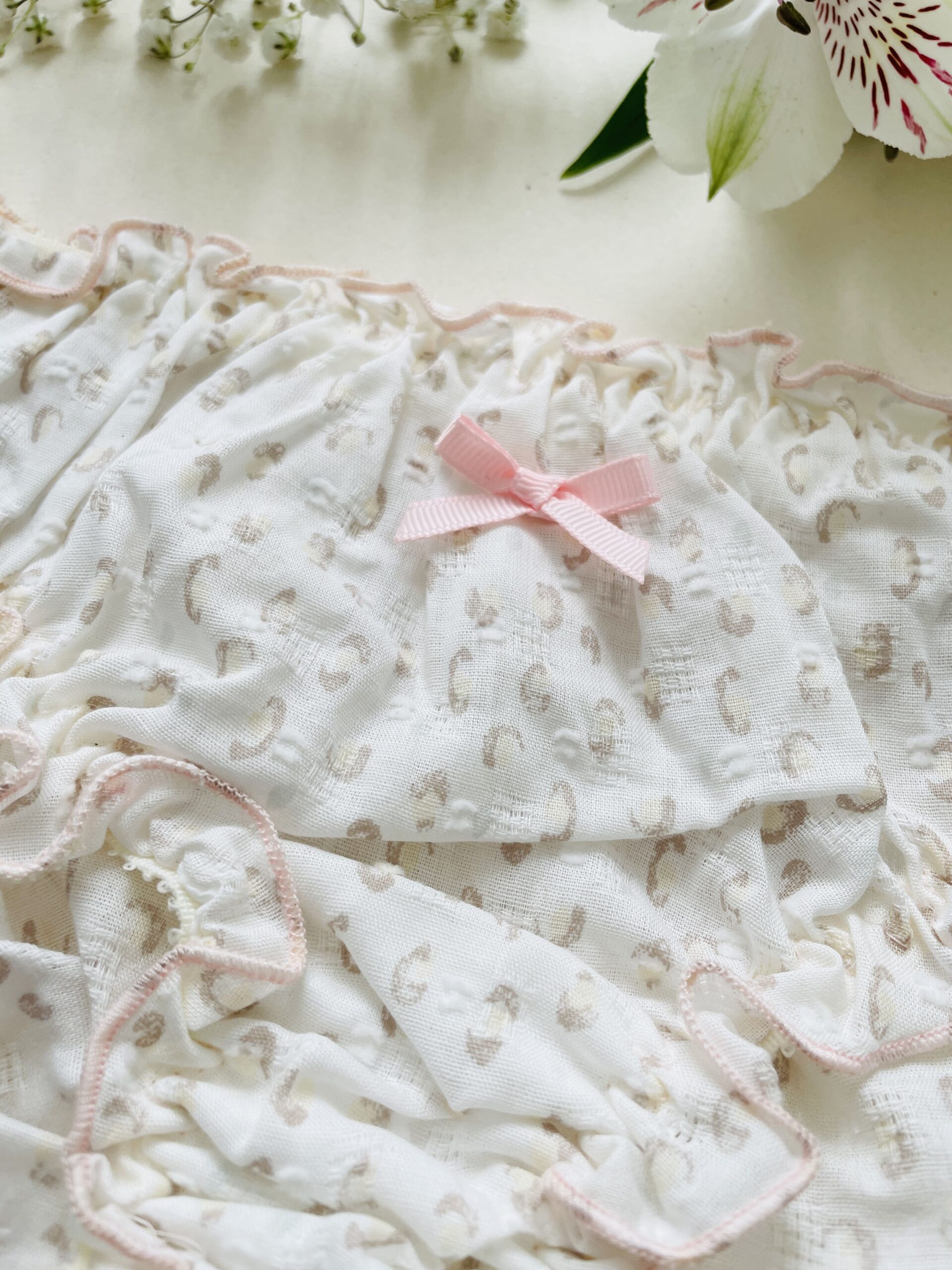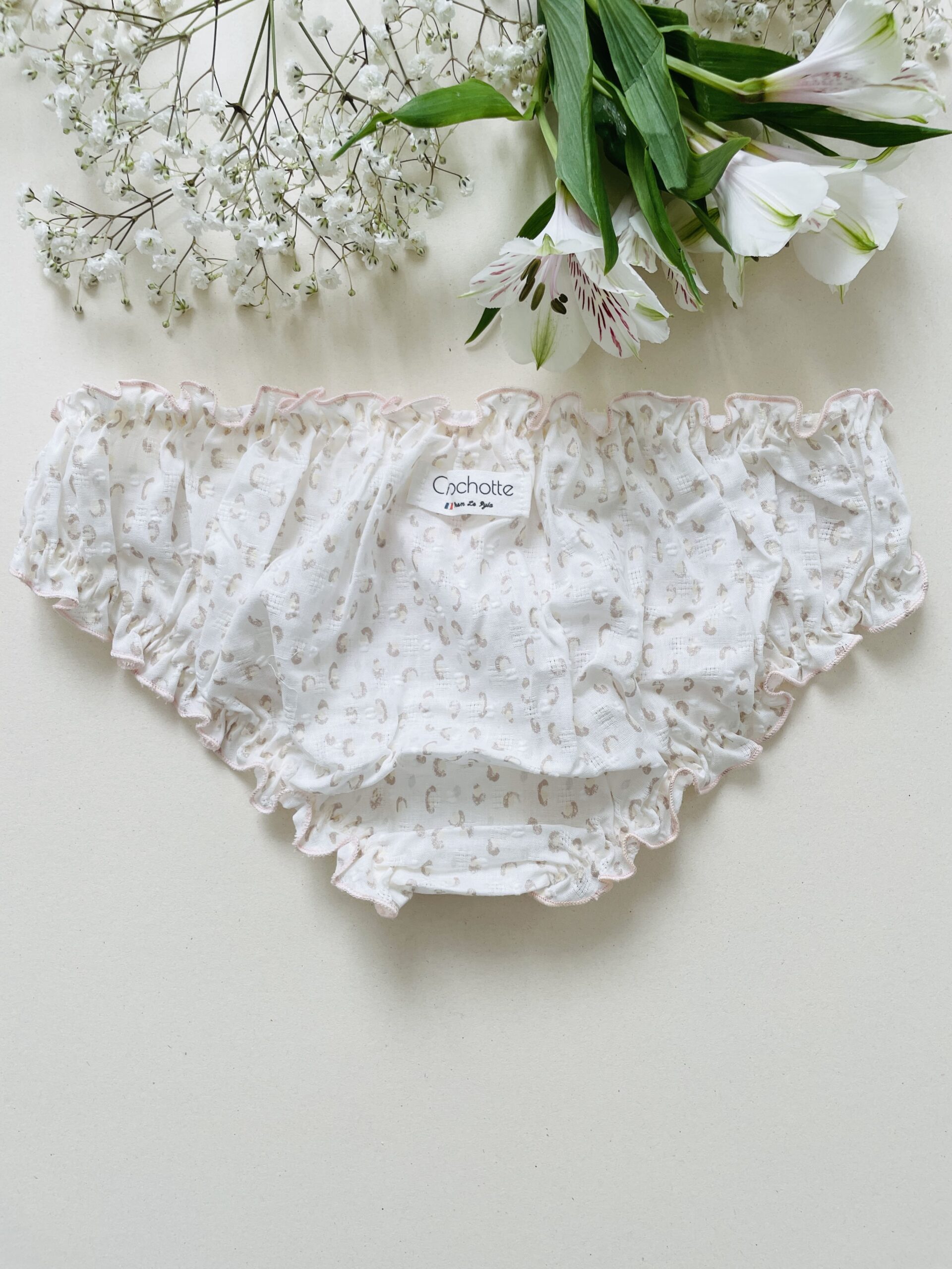 Le bloomer Babycat est en plumetis avec un imprimé léopard très discret, et cela en fait tout son charme. Il est taille basse et couvrant à l’arrière, pour le meilleur confort de votre joli popotin!