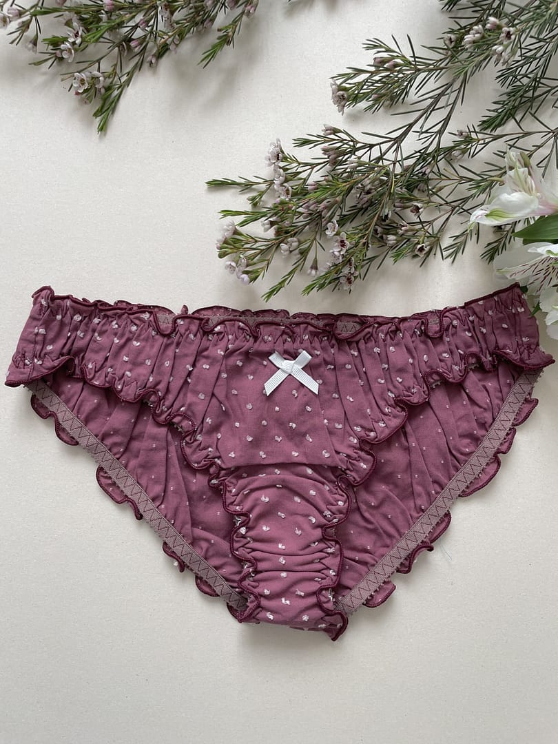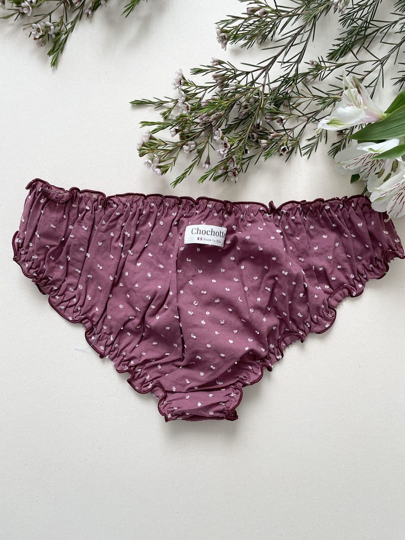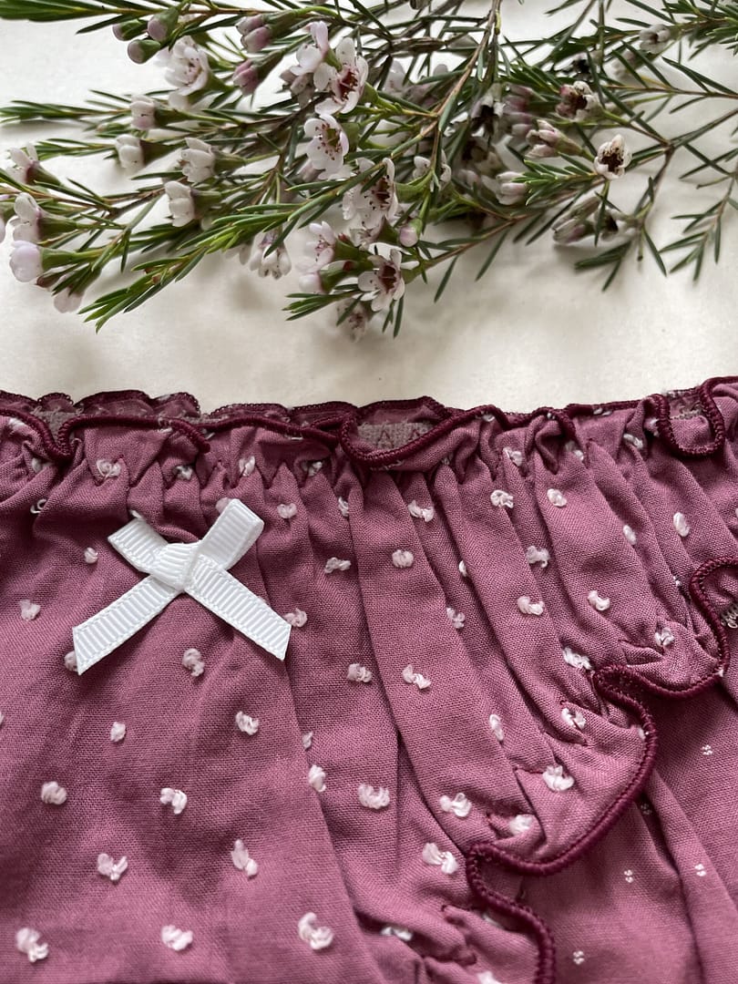 Culotte pour femme type bloomer à froufrous 100% voile de coton, certifié OEKO TEX – GOTS, 100% made in France, 100%  fait main avec amour. Le bloomer Belle endormie est en plumetis sur un fond bordeaux! Il est taille basse et couvrant à l’arrière, pour le meilleur confort de votre joli popotin! Il s’agit d’une édition limitée. Existe également en version brésilienne, shorty et en blouse « babydoll ».