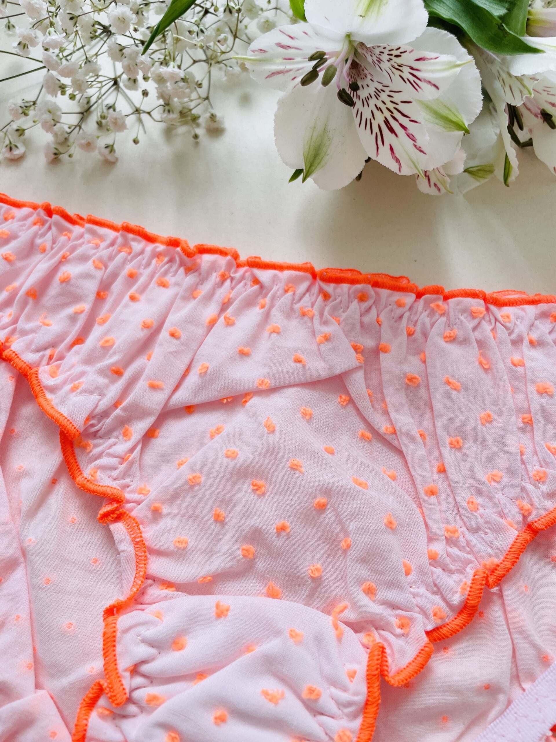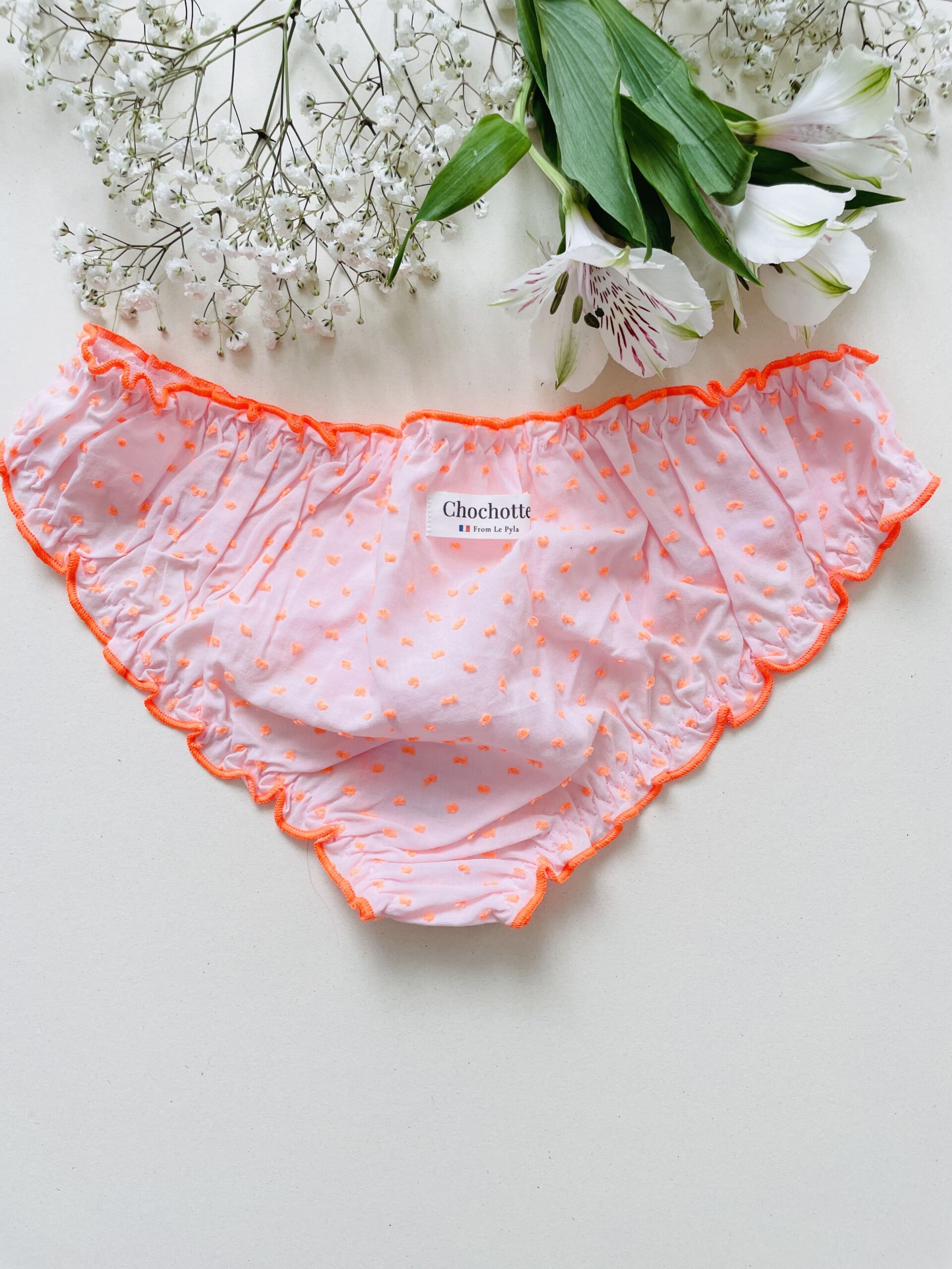 Le bloomer Bonbon est a plumetis orange fluo sur fond rose pastel, réhaussé d’un surfilage orange fluo. Il est taille basse et couvrant à l’arrière, pour le meilleur confort de votre joli popotin!