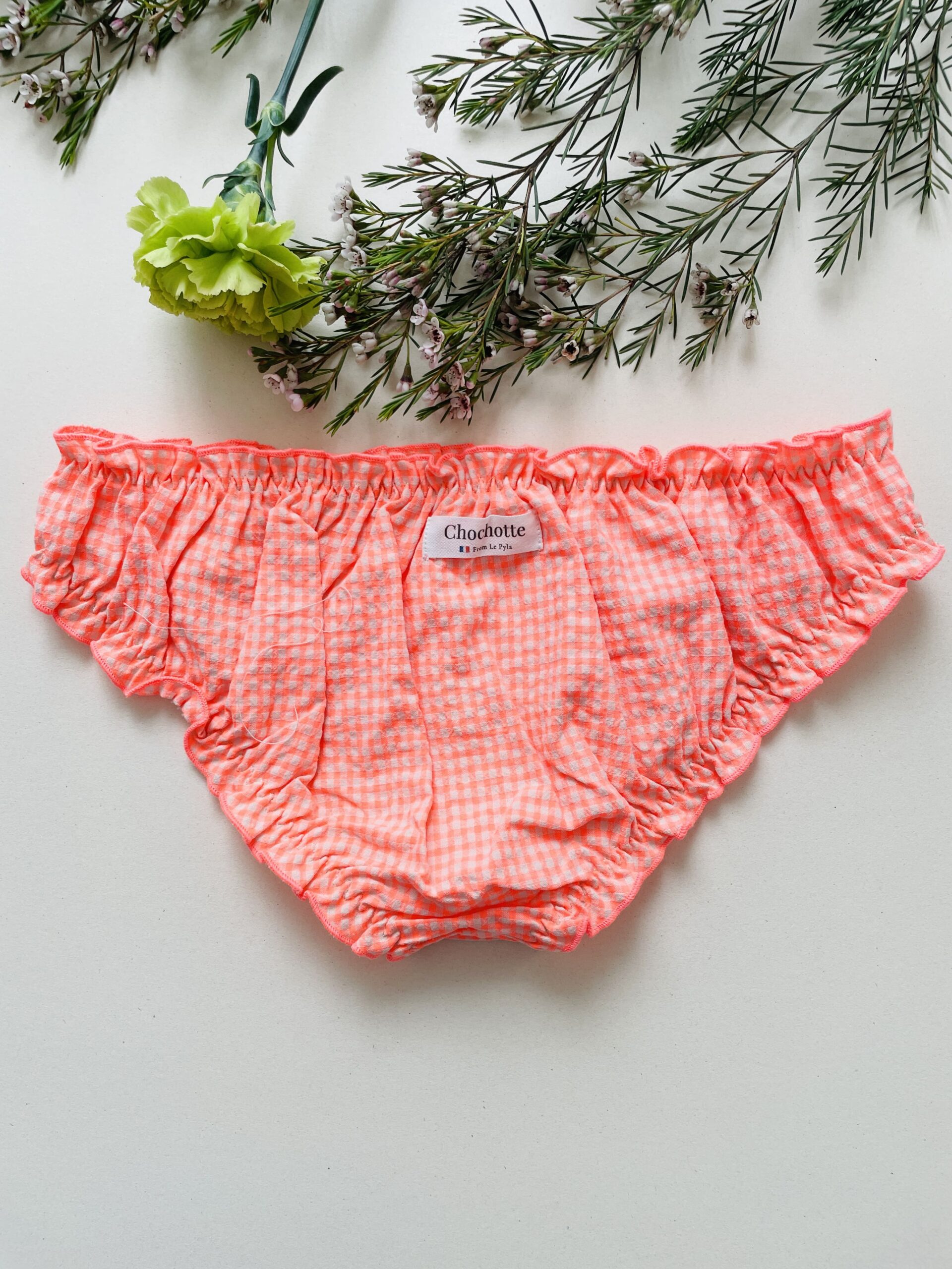 Le bloomer Charlotte est de couleur corail fluo et blanc, un joli vichy! Il est taille basse et couvrant à l’arrière, pour le meilleur confort de votre joli popotin!