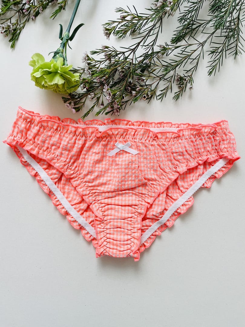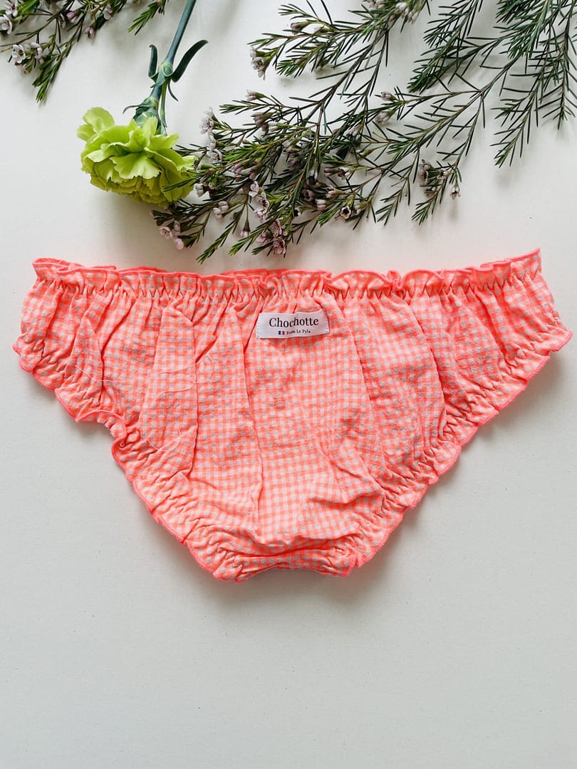 Culotte pour femme type bloomer à froufrous 100% coton seersucker, certifié OEKO TEX – GOTS, 100% made in France, 100%  fait main avec amour. Le bloomer Charlotte est de couleur corail fluo et blanc, un joli vichy! Il est taille basse et couvrant à l’arrière, pour le meilleur confort de votre joli popotin! Il s’agit d’une édition limitée. Existe également en version brésilienne.