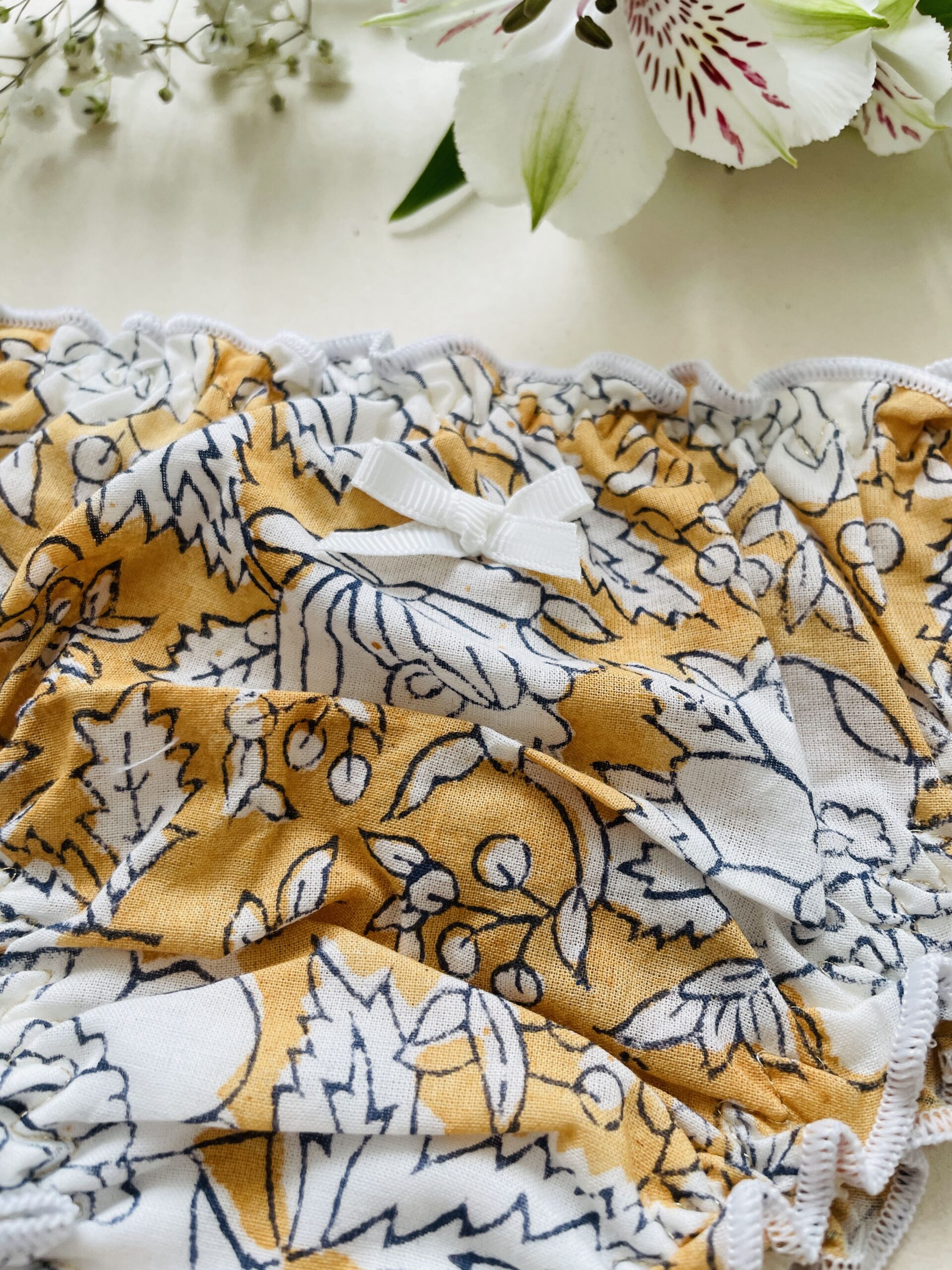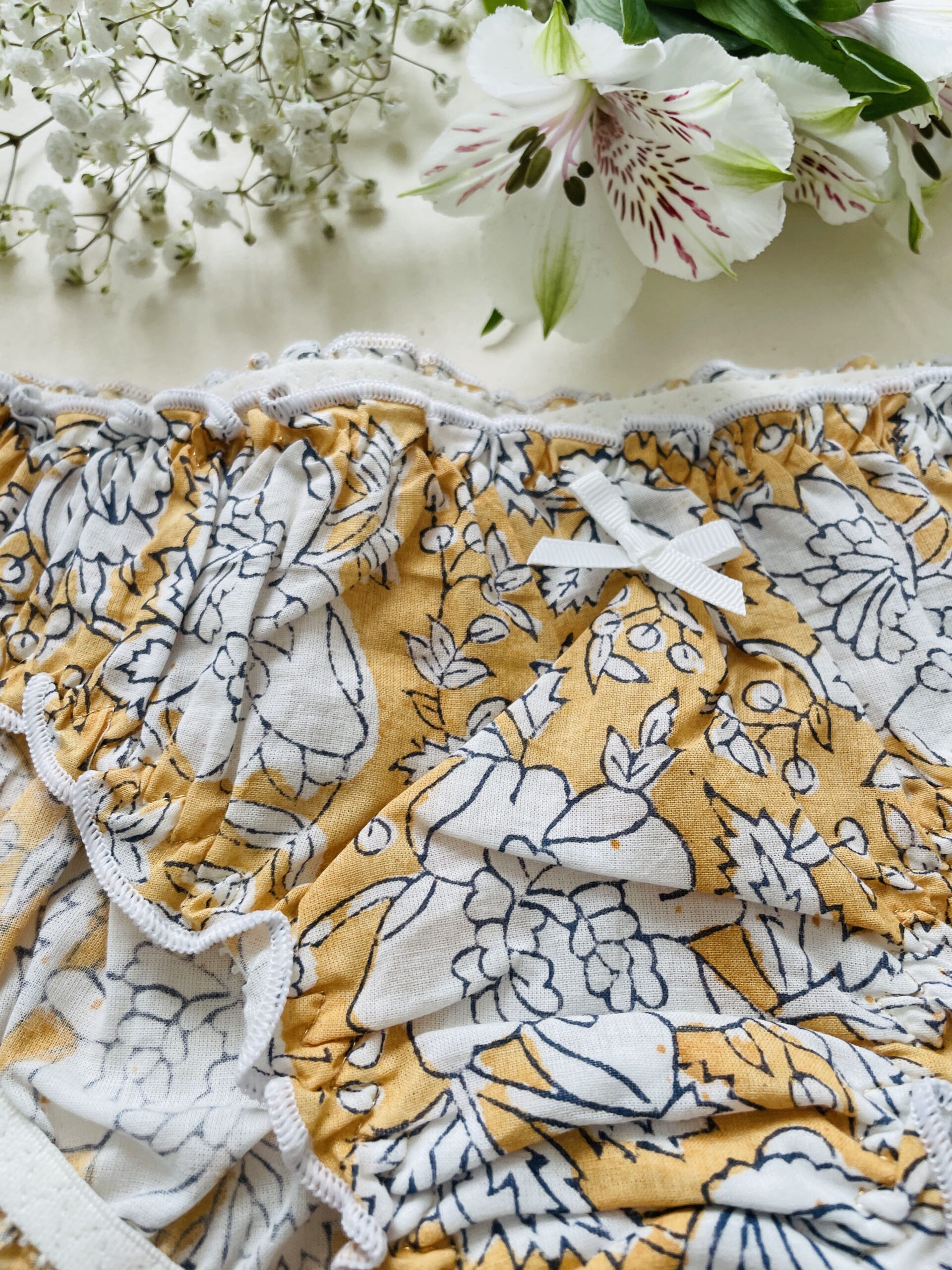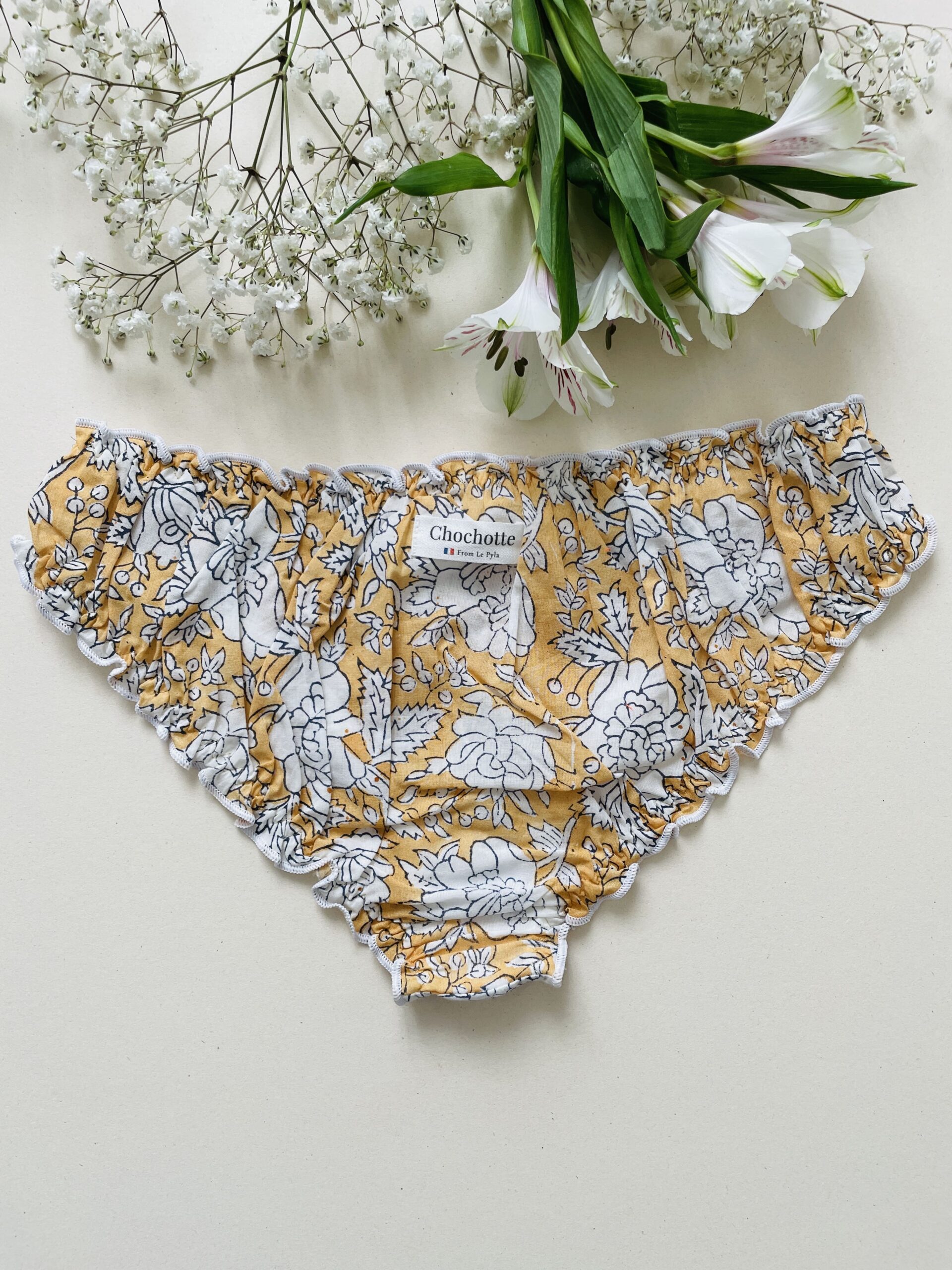 Le bloomer Indira a un imprimé floral indien beige sur fond blanc. Il est taille basse et couvrant à l’arrière, pour le meilleur confort de votre joli popotin!