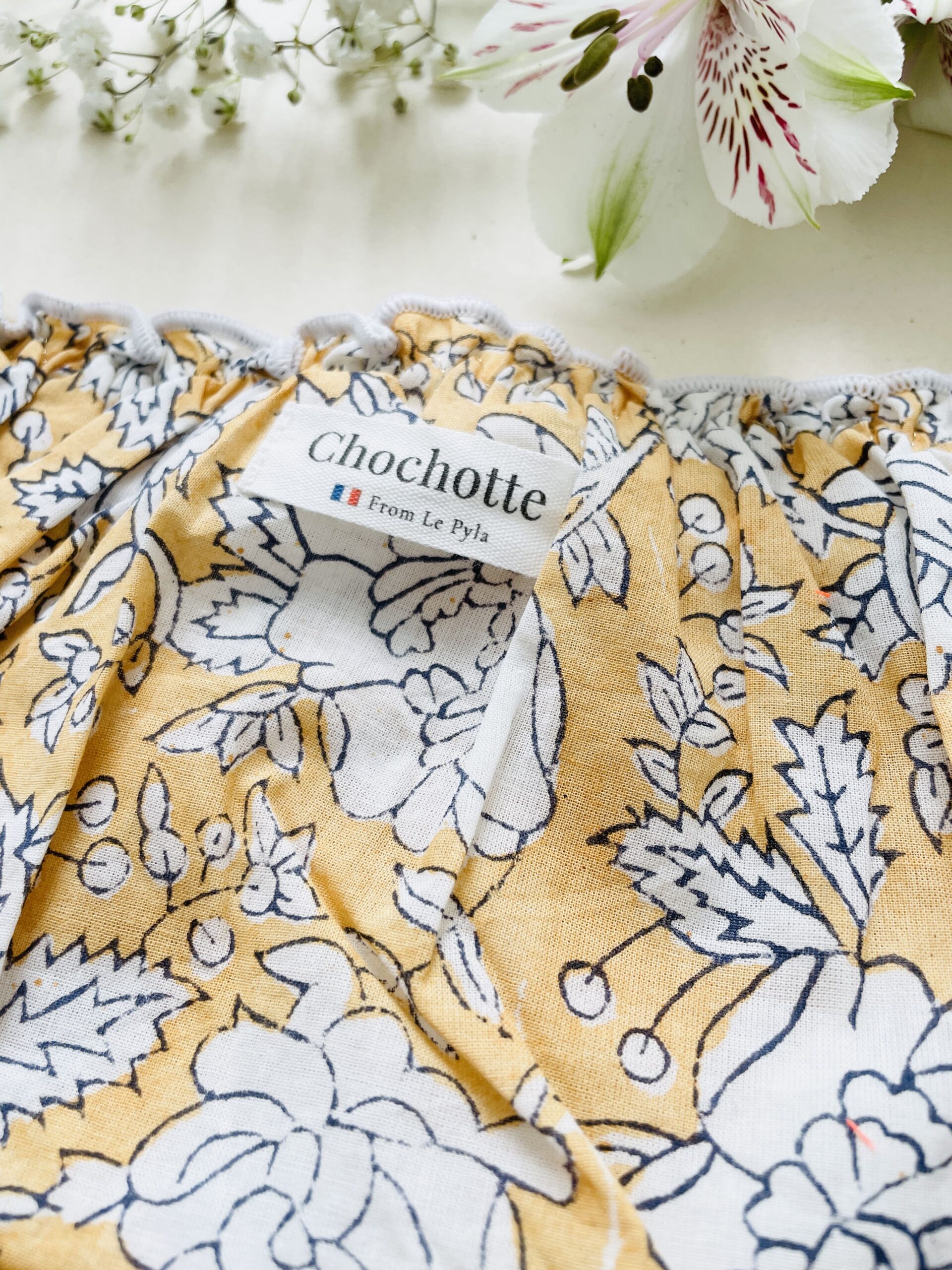 Culotte pour femme type bloomer à froufrous 100% voile de coton, imprimé block print réalisé à la main en Inde, 100% confectionné par mes soins sur le Bassin d’Arcachon.