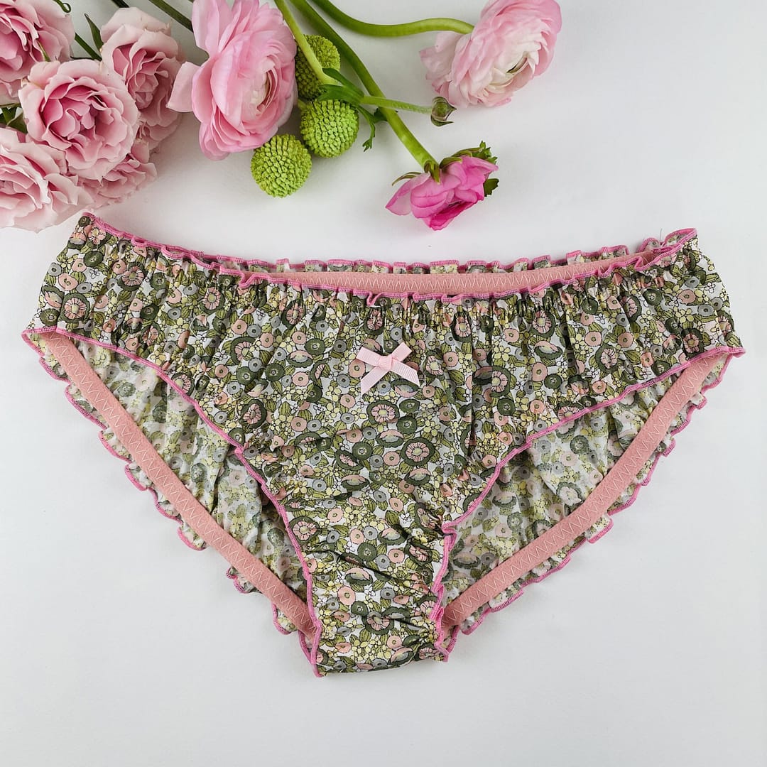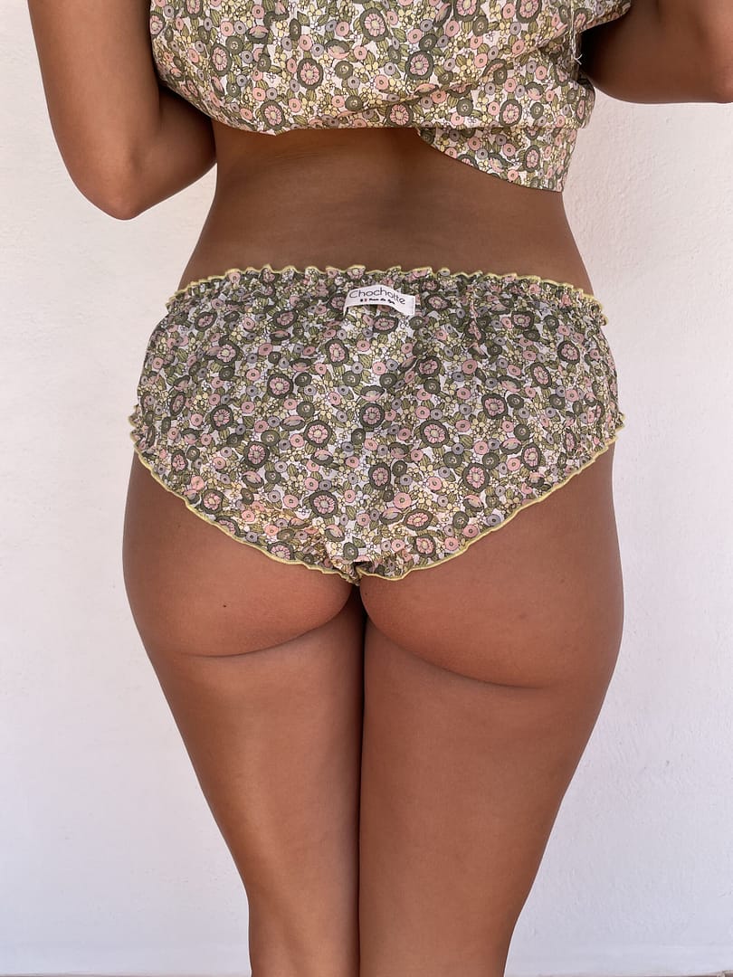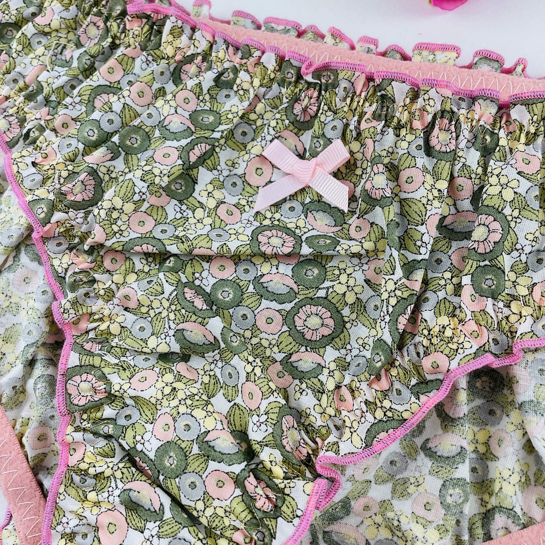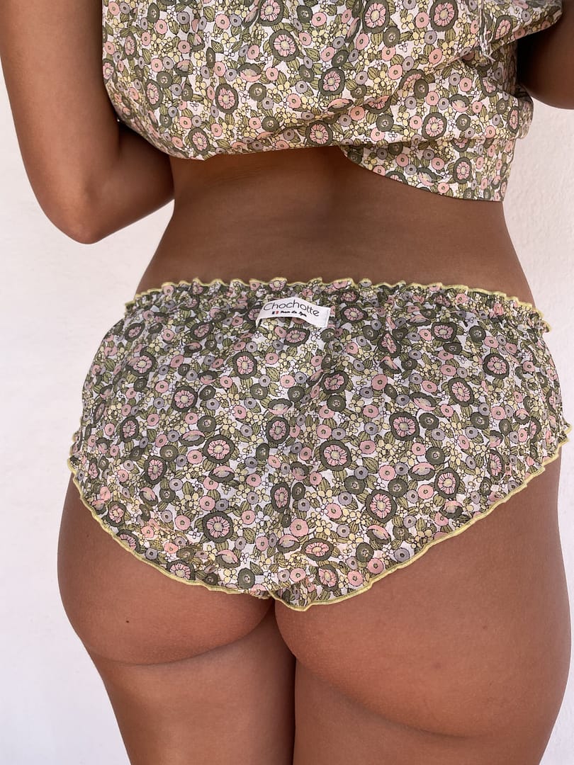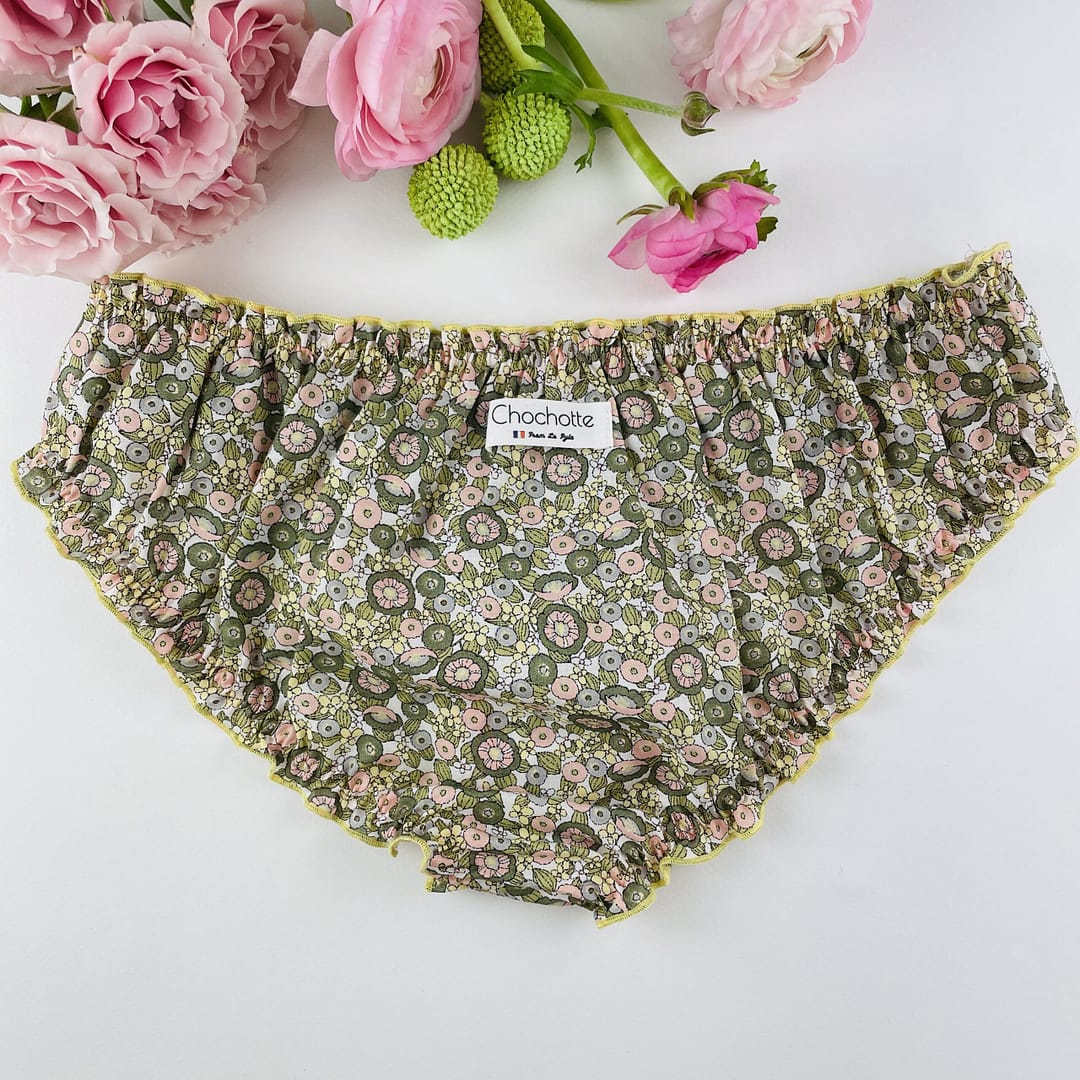 Culotte pour femme type bloomer à froufrous 100% en voile de coton soyeux certifié OEKO-TEX GOTS, 100% made in France, 100%  fait main avec amour. Le bloomer Olive a un imprimé floral multi-couleur dans les tons vert olive, réhaussé d’un joli surfilage rose ou jaune! Il est taille basse et couvrant à l’arrière, pour le meilleur confort de votre joli popotin! Il s’agit d’une édition limitée. Existe également en version brésilienne et en blouse « babydoll ».