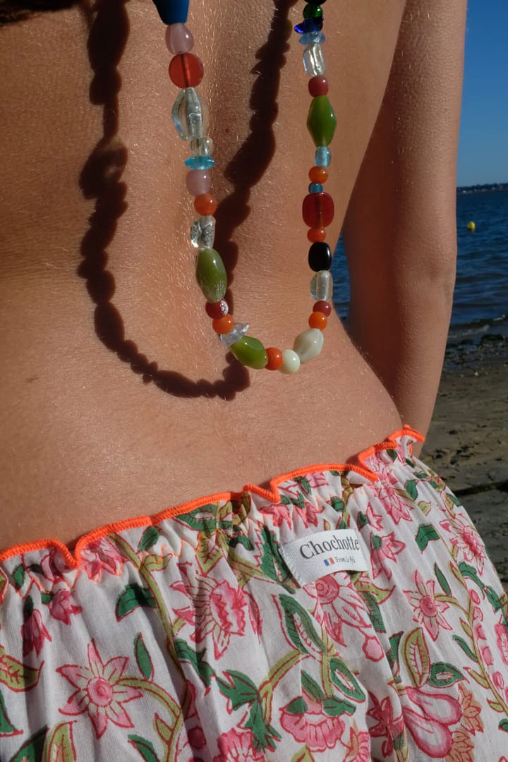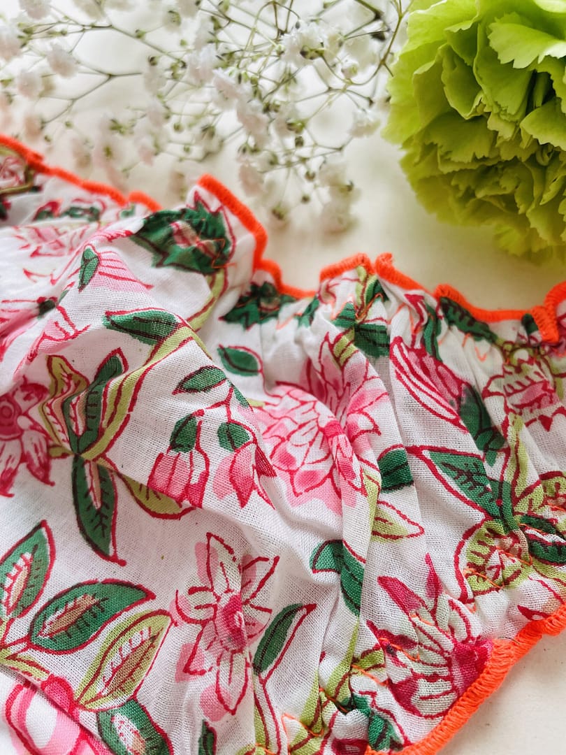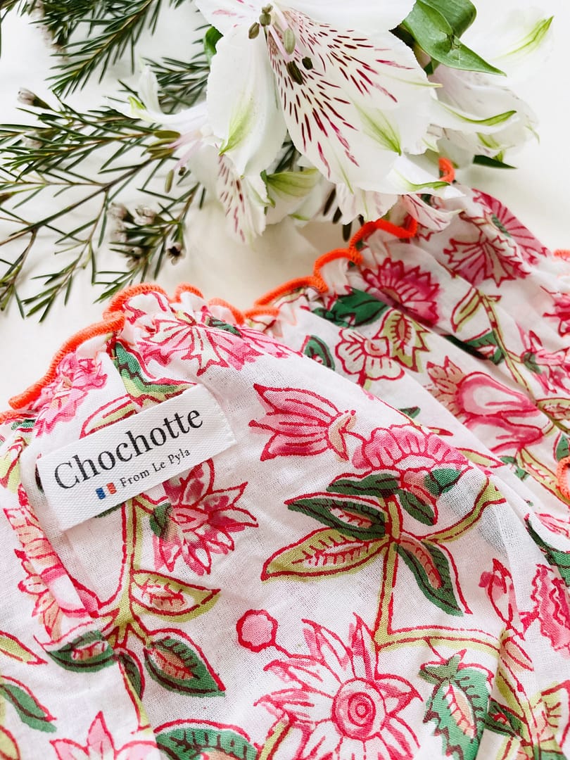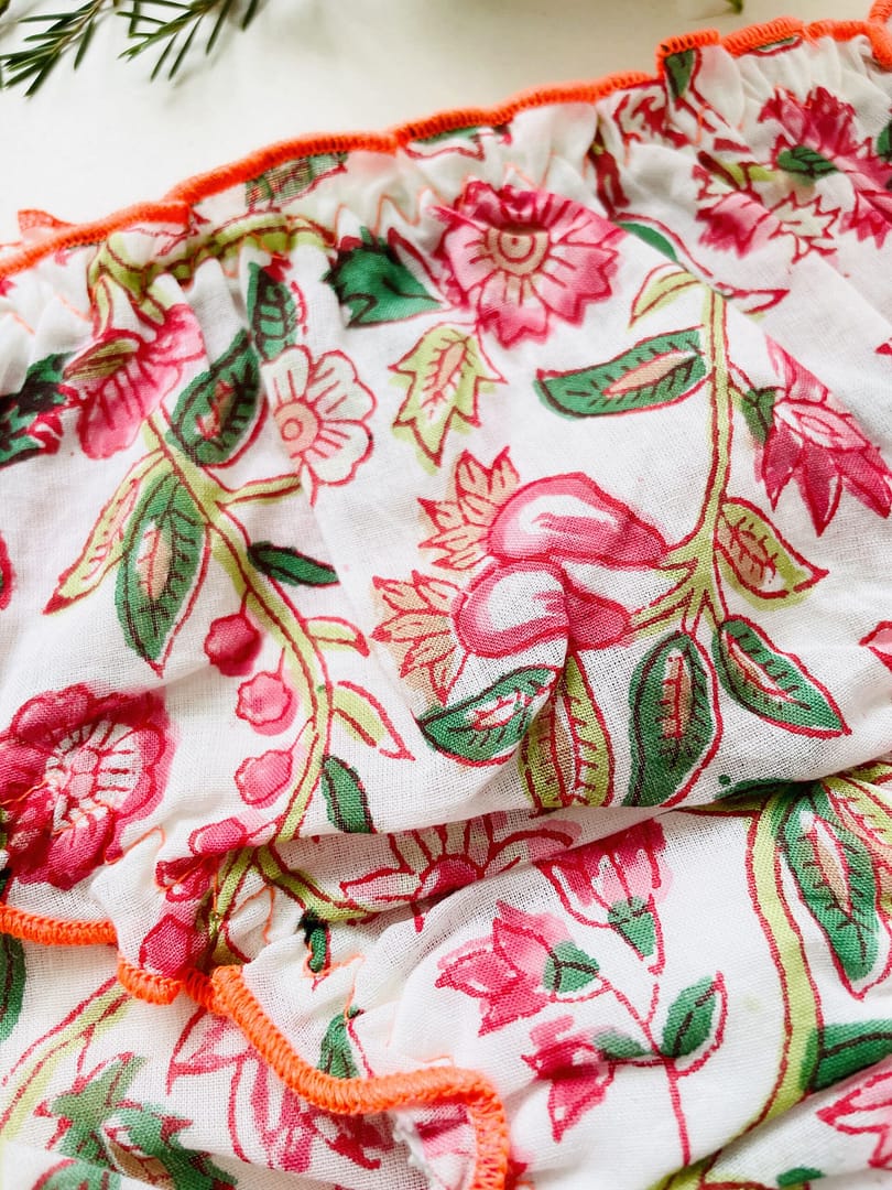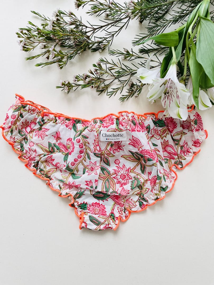 Culotte pour femme type bloomer à froufrous 100% voile de coton, imprimé block print réalisé à la main en Inde, 100% confectionné par mes soins sur le Bassin d’Arcachon. Le bloomer Pondichérie a un imprimé floral multicolore sur fond blanc. Il est taille basse et couvrant à l’arrière, pour le meilleur confort de votre joli popotin! Il s’agit d’une édition limitée. Existe également en version brésilienne, shorty et blouse « babydoll ».