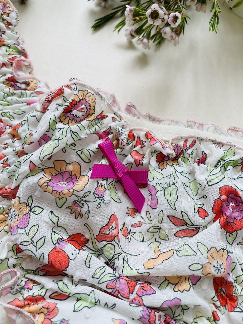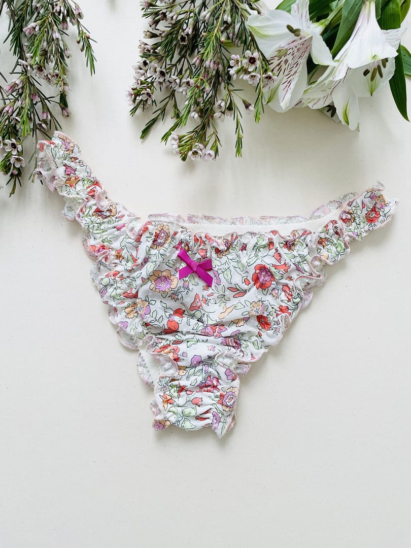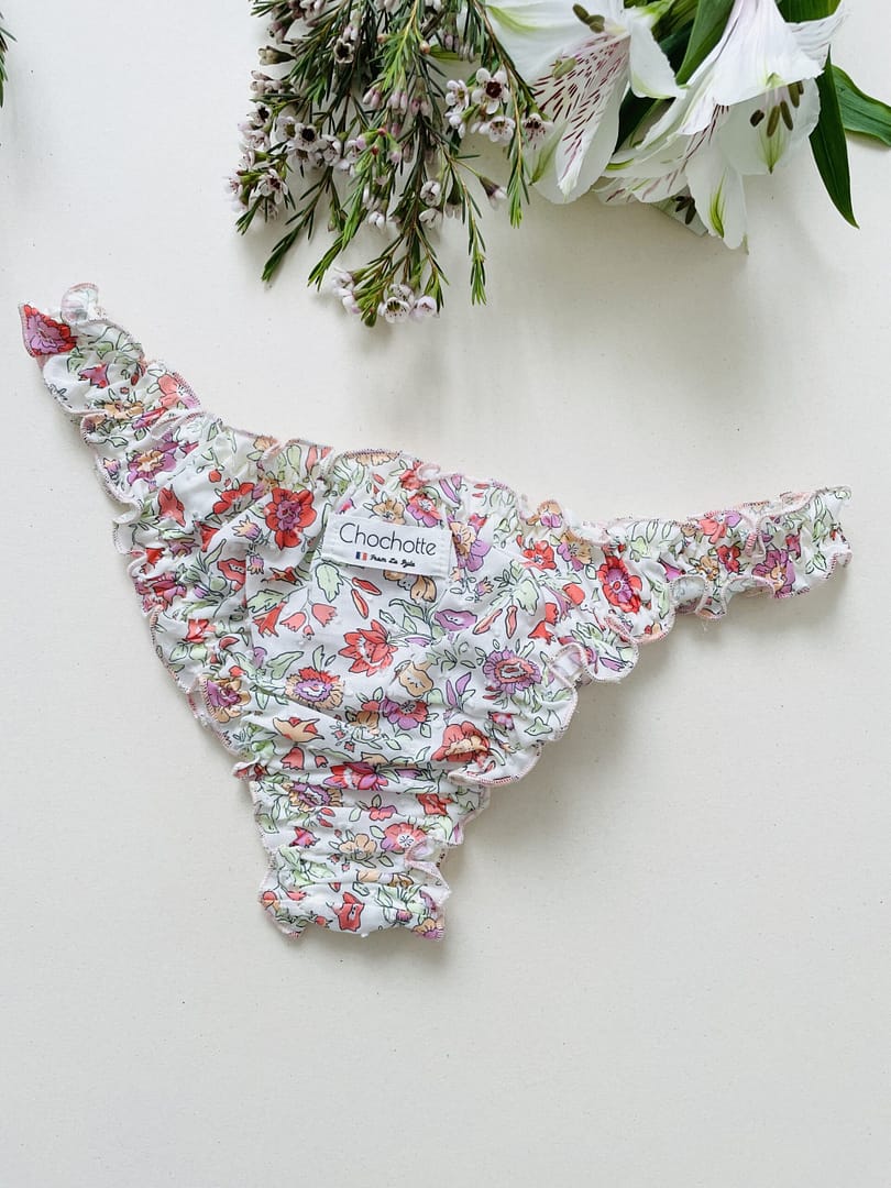Culotte pour femme type brésilienne à froufrous 100% en voile de coton certifié Oeko Tex, 100% confectionné par mes soins sur le Bassin d’Arachon. La culotte brésilienne Henriette est taille basse et échancrée à l’arrière, pour mettre en valeur votre joli popotin. Elle a un joli imprimé fleuri, réhaussée de plumetis. Chaque modèle est unique. Elle vous apportera légèreté et sensualité. Chaque modèle est unique, il peut y avoir des variantes au niveau du sens des soleils, afin de faire le moins . Si vous souhaitez exactement le même modèle que sur la photo, n’hésitez pas à me le préciser en commentaire. Il s’agit d’une édition limitée. Existe également en version bloomer, shorty et blouse.
