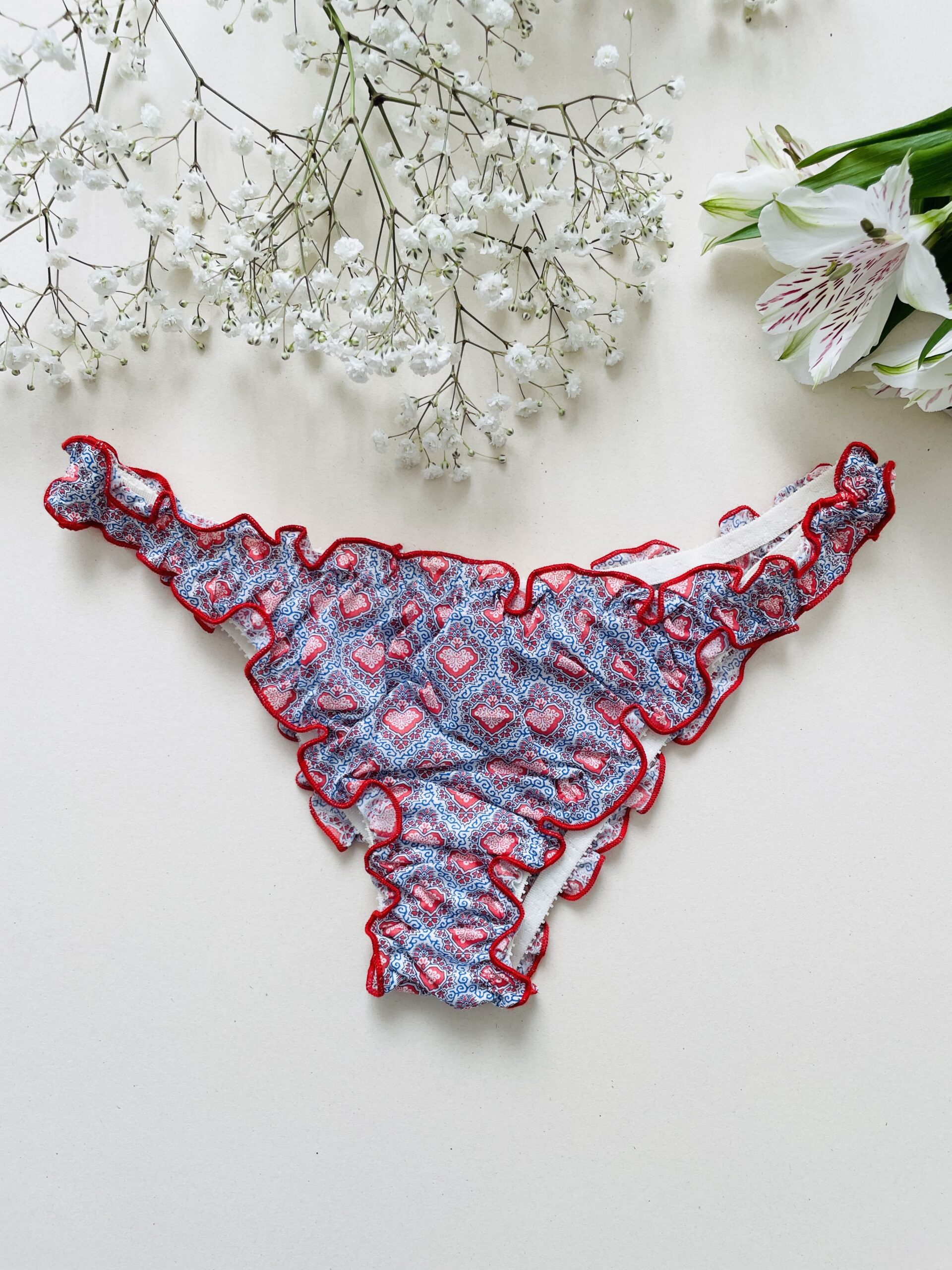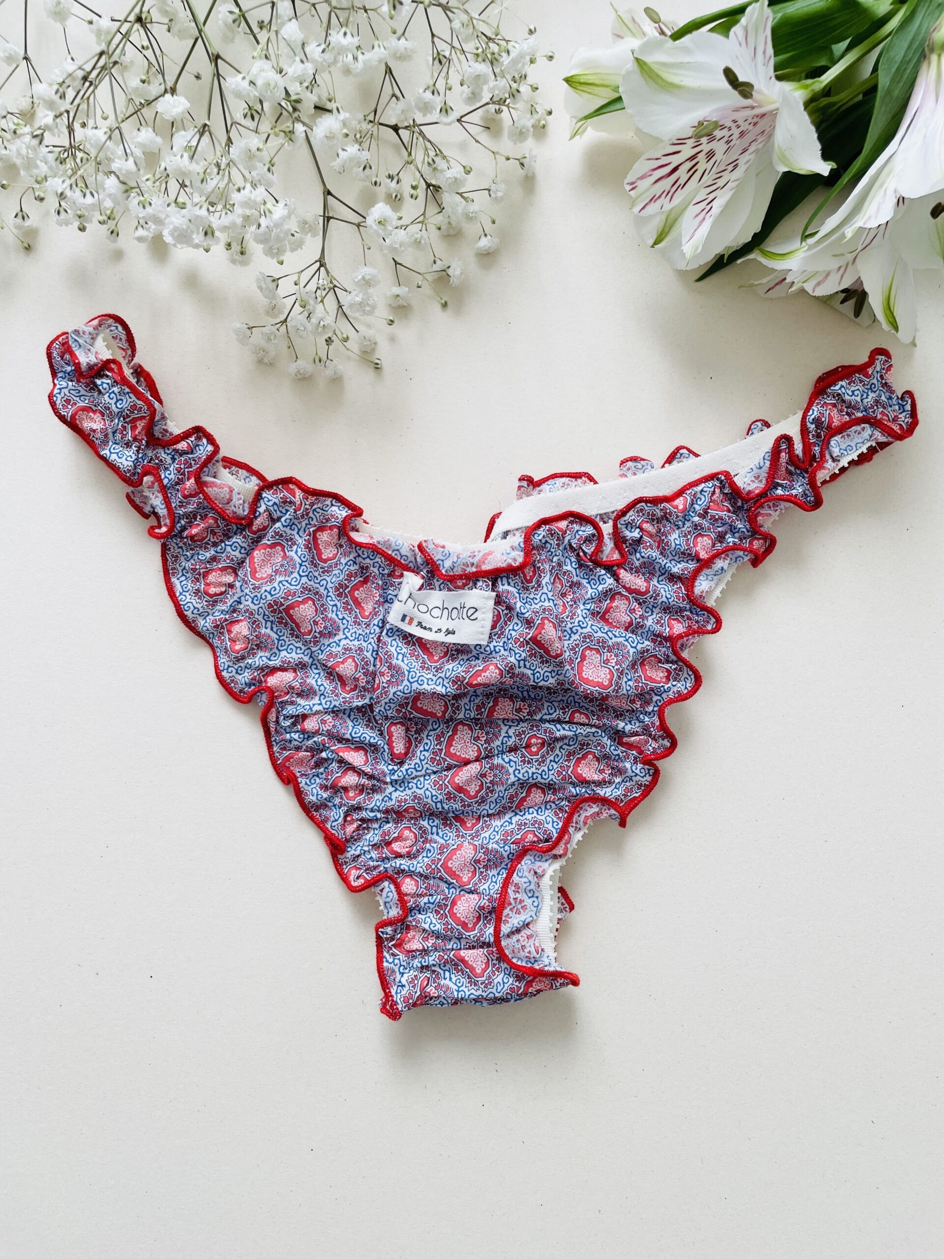 Culotte pour femme type brésilienne à froufrous 100% en voile de coton de la marque Liberty London, confection 100% made in France, 100%  fait par mes soins avec amour. La culotte brésilienne Mon amour est taille basse et échancrée à l’arrière, pour mettre en valeur votre joli popotin. Elle a un joli imprimé à coeurs, bordée d’un surfilage rouge. Chaque modèle est unique. Elle vous apportera légèreté et sensualité. Chaque modèle est unique, il peut y avoir des variantes au niveau du sens des soleils, afin de faire le moins . Si vous souhaitez exactement le même modèle que sur la photo, n’hésitez pas à me le préciser en commentaire. Il s’agit d’une édition limitée. Existe également en version bloomer et shorty.