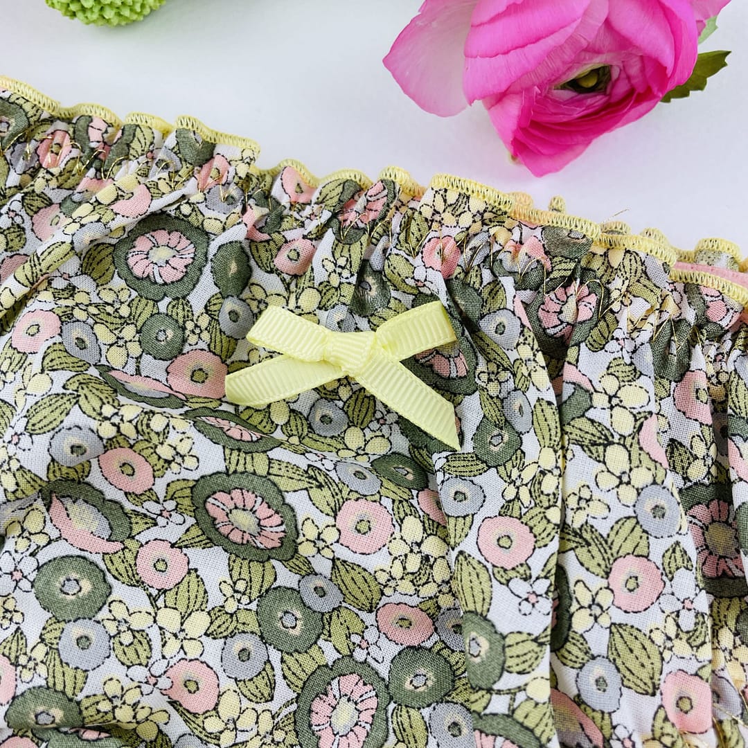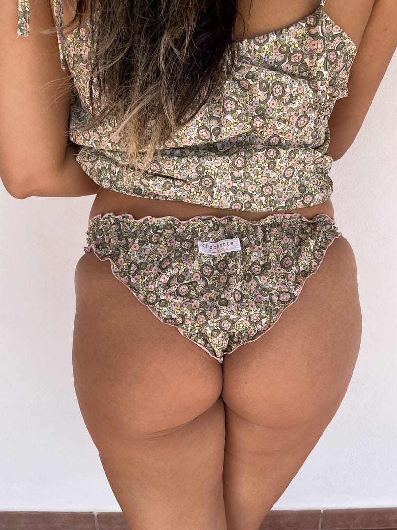 Culotte pour femme type brésilienne à froufrous 100% en voile de coton, 100% made in France, 100%  fait main avec amour. La culotte brésilienne Olive est taille basse et échancrée à l’arrière, pour mettre en valeur votre joli popotin. Son imprimé fleuri, vous apportera légèreté et sensualité, pour un effet complètement rétro! Chaque modèle est unique, il peut y avoir des variantes au niveau de la couleur du noeud et du surfilage. Si vous souhaitez exactement le même modèle que sur la photo, n’hésitez pas à me le préciser en commentaire. Il s’agit d’une édition limitée. Existe également en version bloomer et en blouse « babydoll ».
