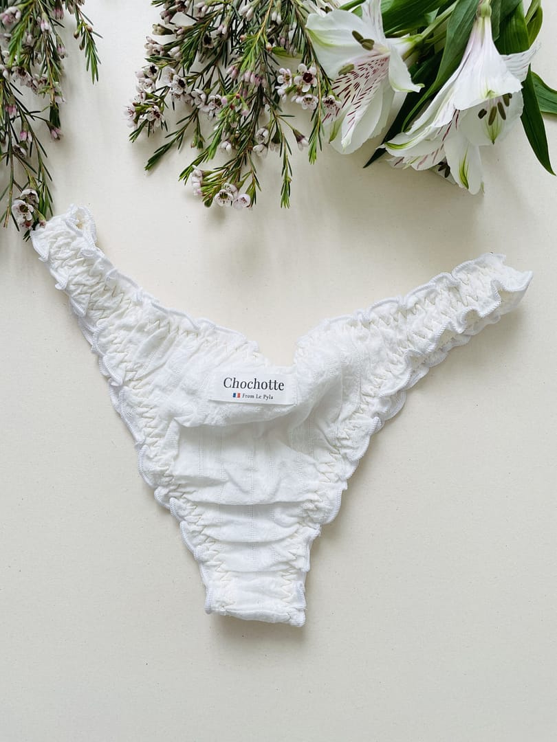 Culotte pour femme type brésilienne à froufrous 100% en voile de coton certifié Oeko Tex, 100% confectionné par mes soins sur le Bassin d’Arachon. La culotte brésilienne Romance est taille basse et échancrée à l’arrière, pour mettre en valeur votre joli popotin. Elle a un joli effet de broderie, réhaussée de coutures en fil doré. Chaque modèle est unique. Elle vous apportera légèreté et sensualité. Chaque modèle est unique, il peut y avoir des variantes au niveau du sens des soleils, afin de faire le moins . Si vous souhaitez exactement le même modèle que sur la photo, n’hésitez pas à me le préciser en commentaire. Il s’agit d’une édition limitée. Existe également en version bloomer, shorty et blouse.