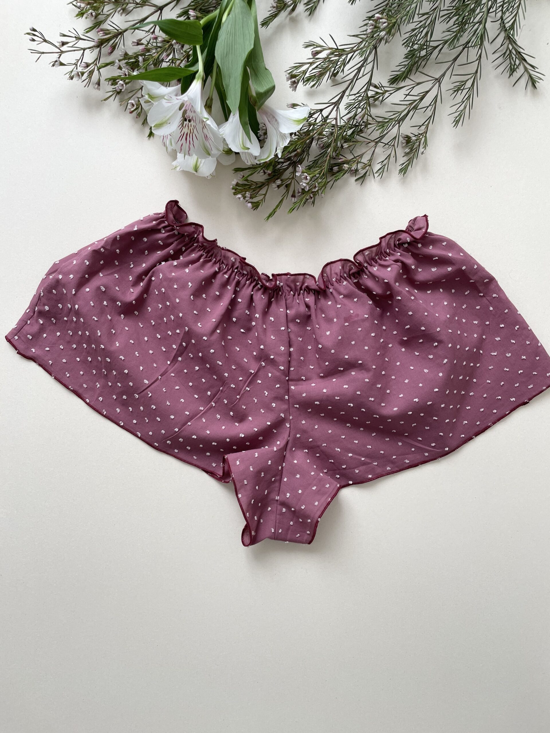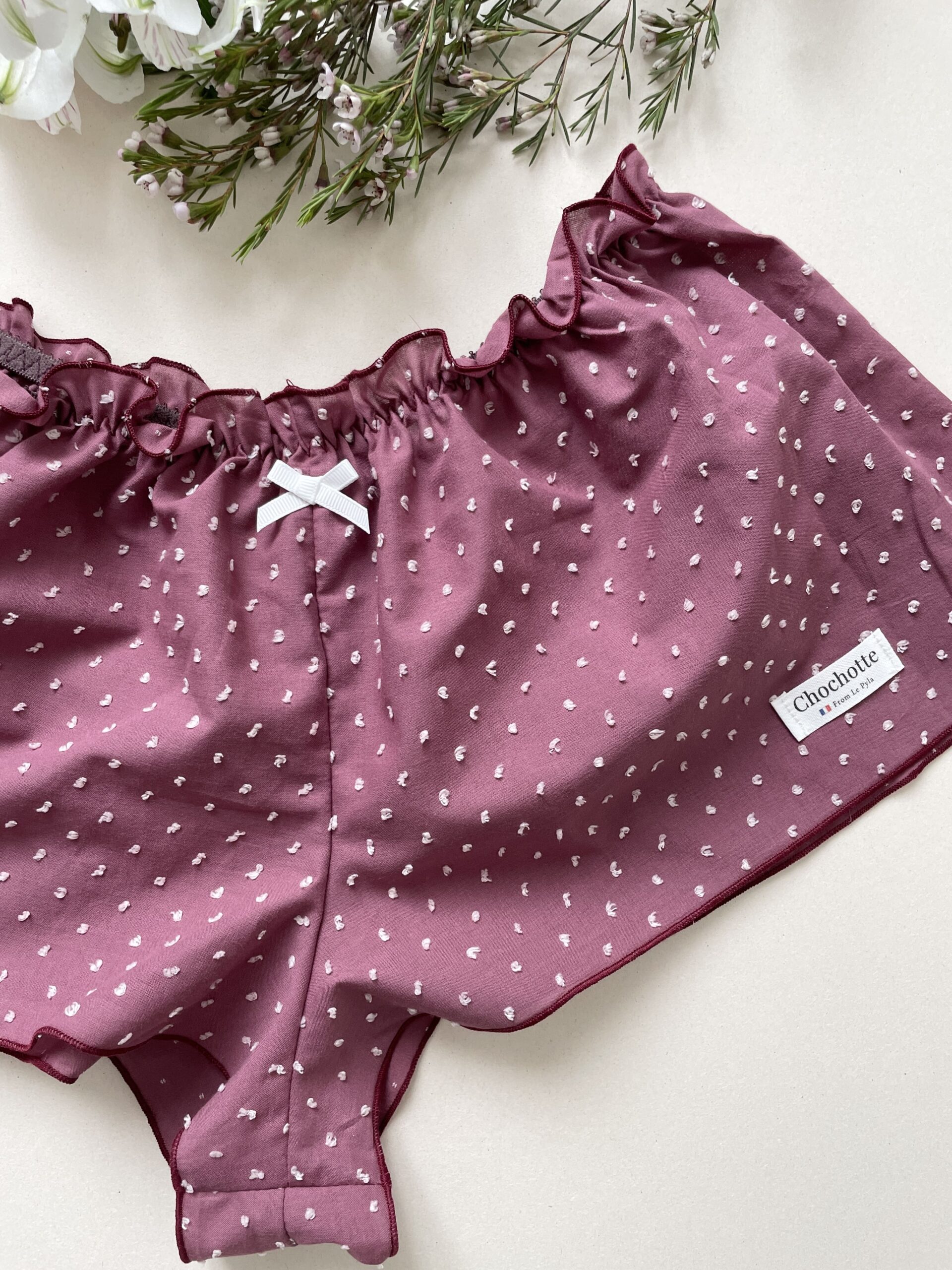 Shorty pour femme avec de jolis froufrous à la ceinture 100% en voile de coton à plumetis certifié Oeko-tex, 100% confectionné par mes soins avec amour au bord du Bassin d’Arcachon.