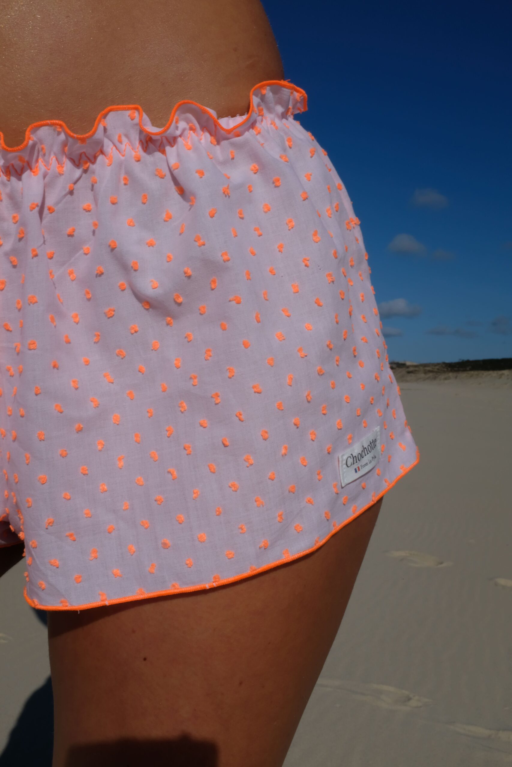Shorty pour femme avec de jolis froufrous à la ceinture 100% en voile de coton à plumetis certifié Oeko-tex, 100% confectionné par mes soins avec amour au bord du Bassin d’Arcachon.