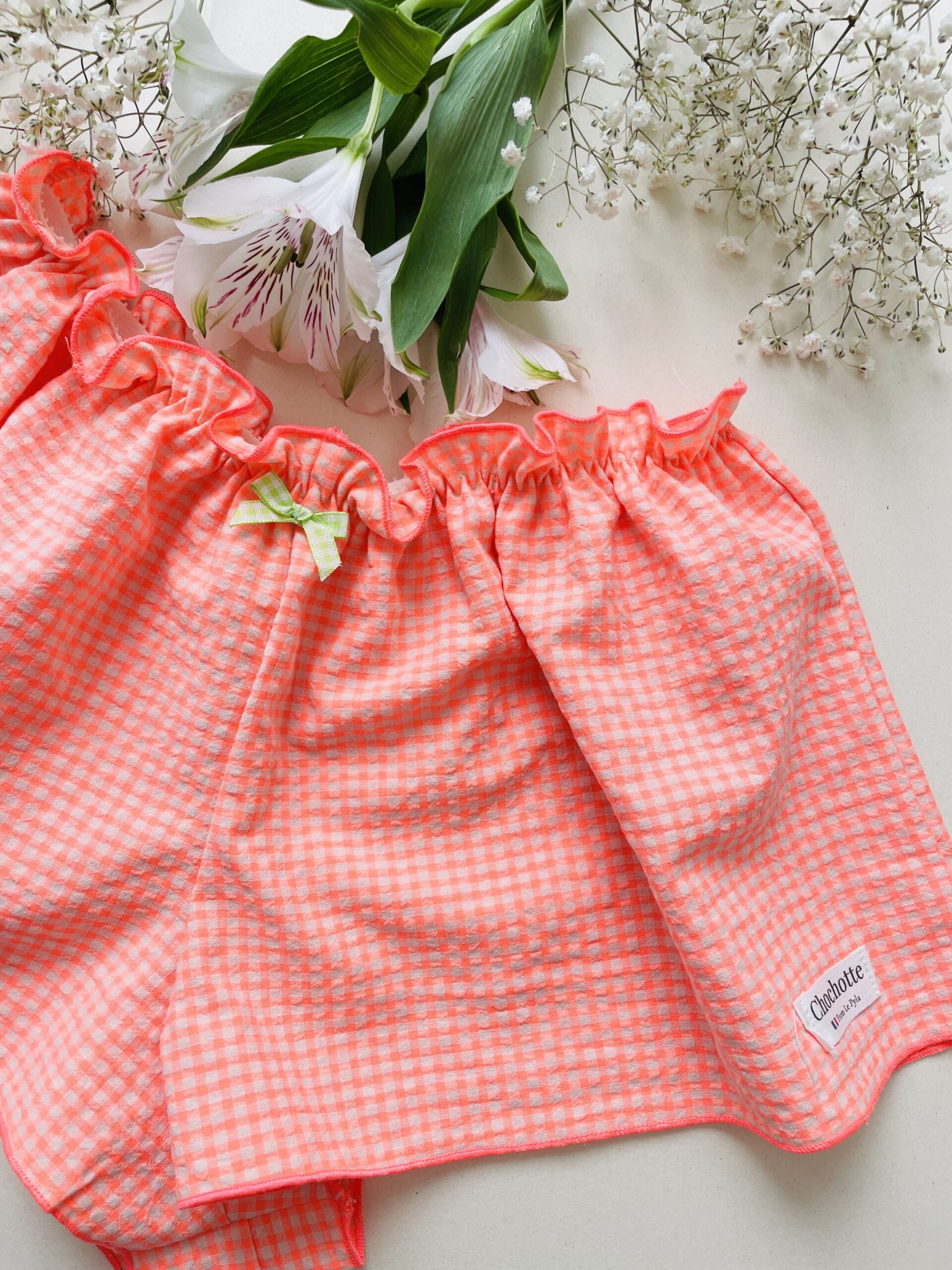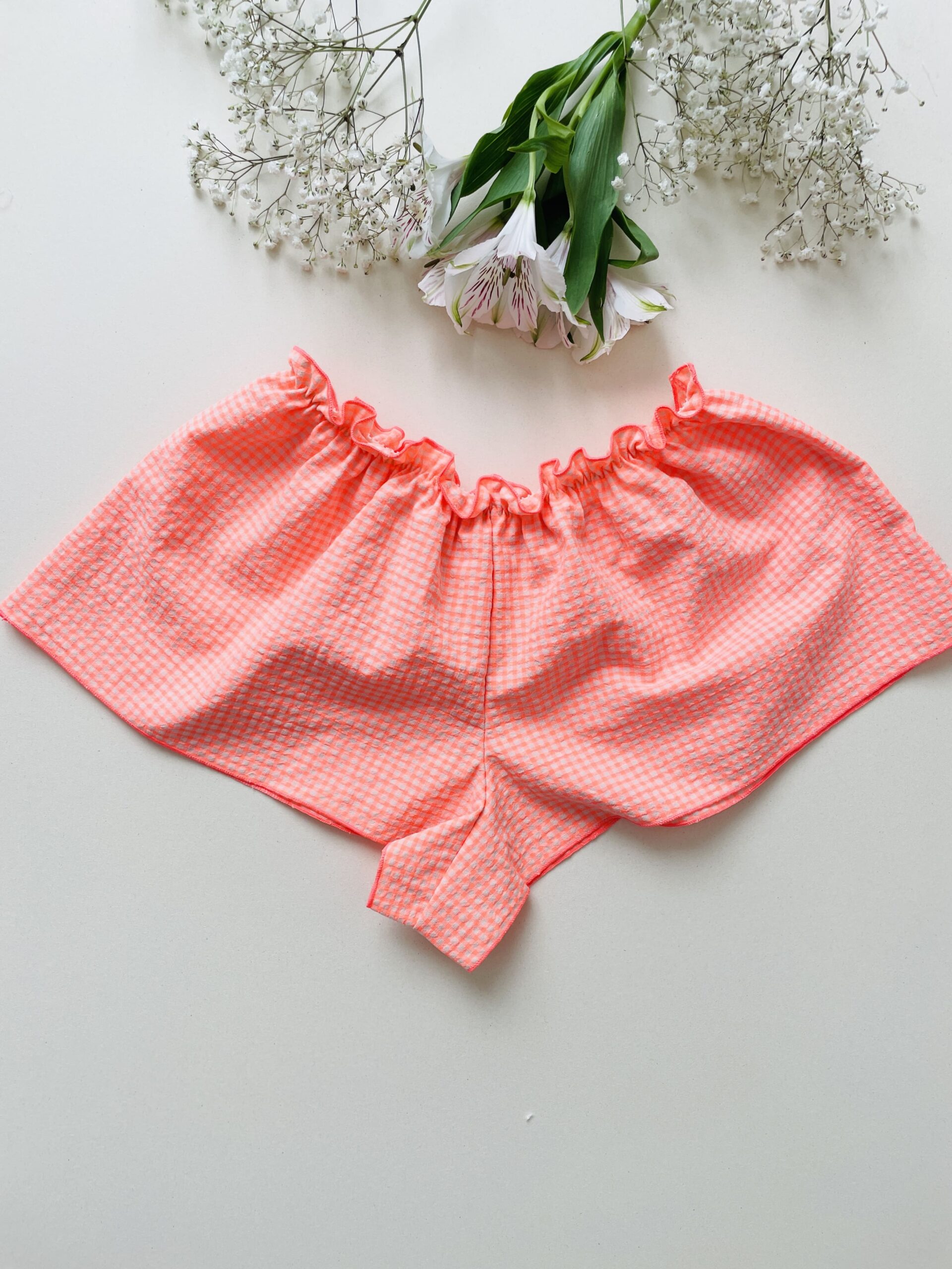 Shorty pour femme avec de jolis froufrous à la ceinture 100% coton seersucker certifié Oeko-tex, 100% confectionné par mes soins avec amour au bord du Bassin d’Arcachon.