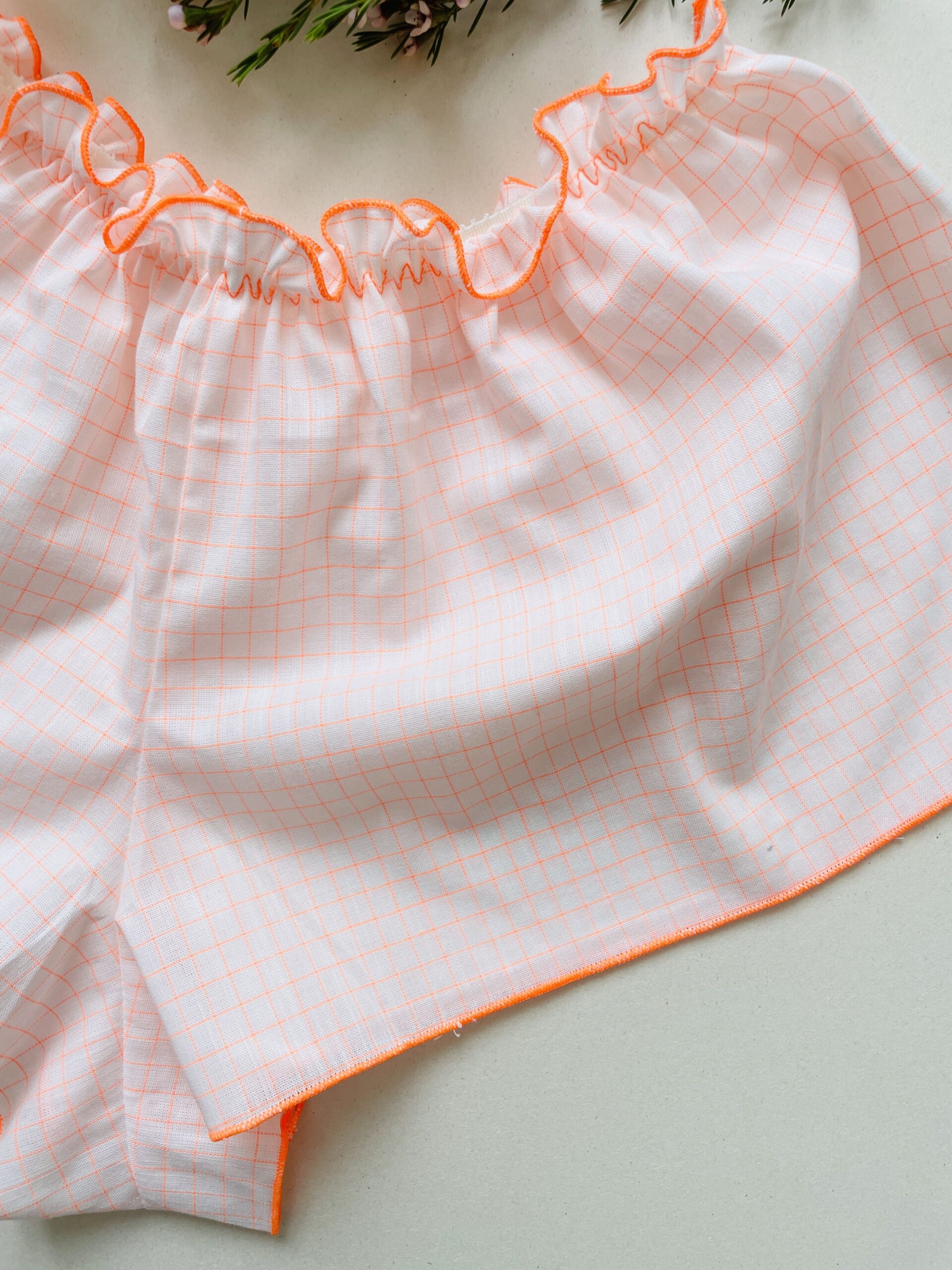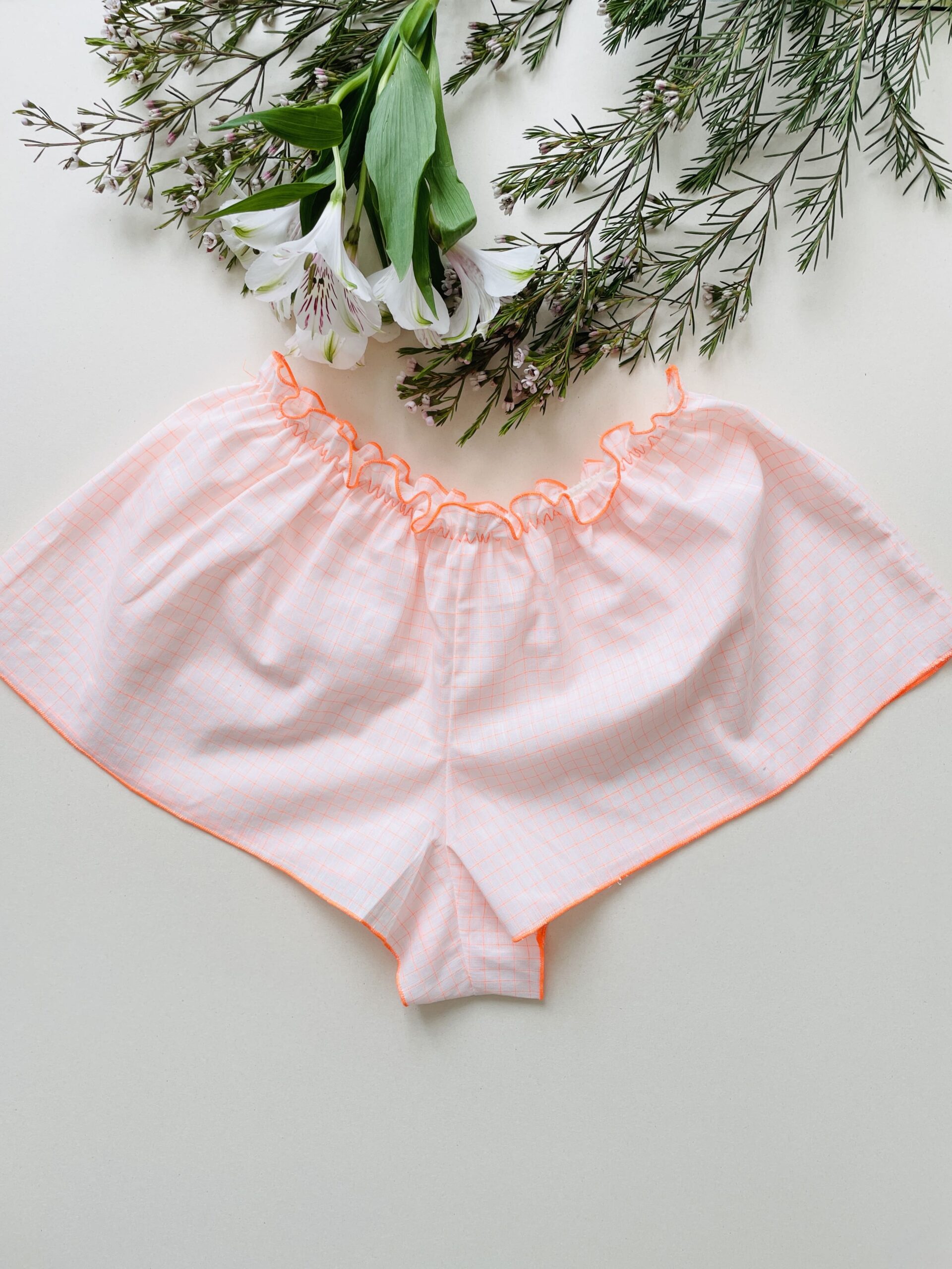 Shorty pour femme avec de jolis froufrous à la ceinture 100% voile de coton certifié Oeko-tex, 100% confectionné par mes soins avec amour au bord du Bassin d’Arcachon.