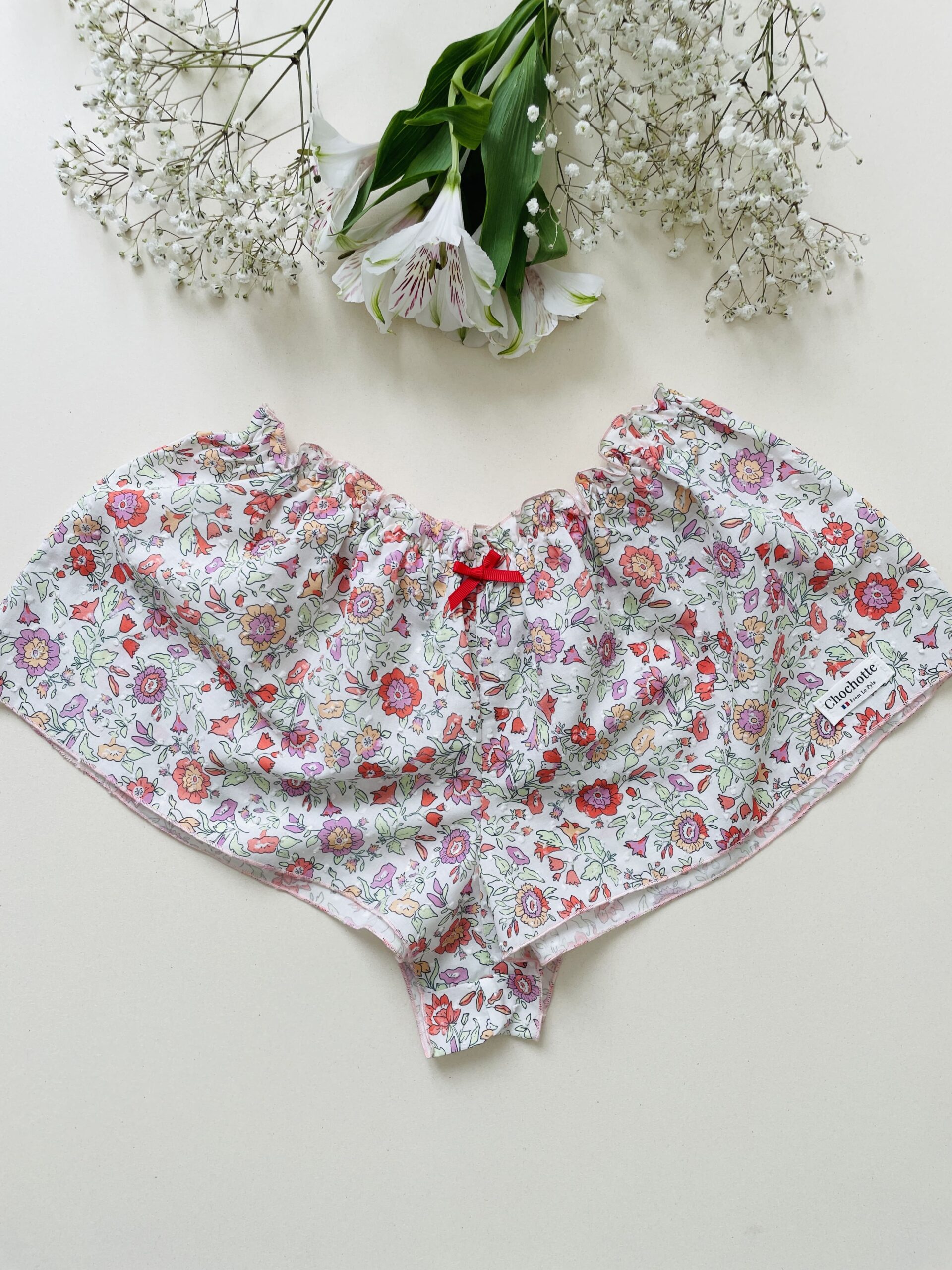 Shorty pour femme avec de jolis froufrous à la ceinture 100% voile de coton à plumetis certifié Oeko-tex, 100% confectionné par mes soins avec amour au bord du Bassin d’Arcachon.