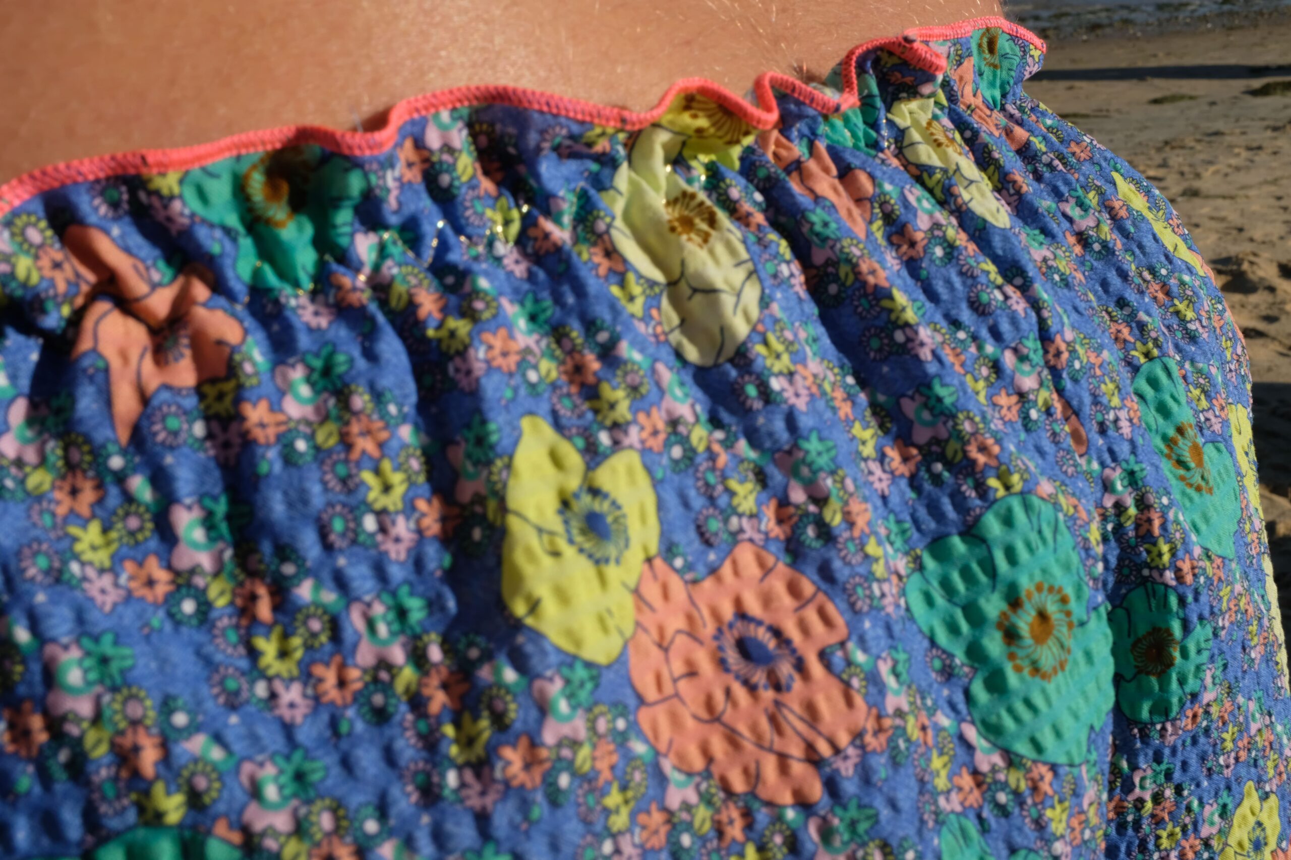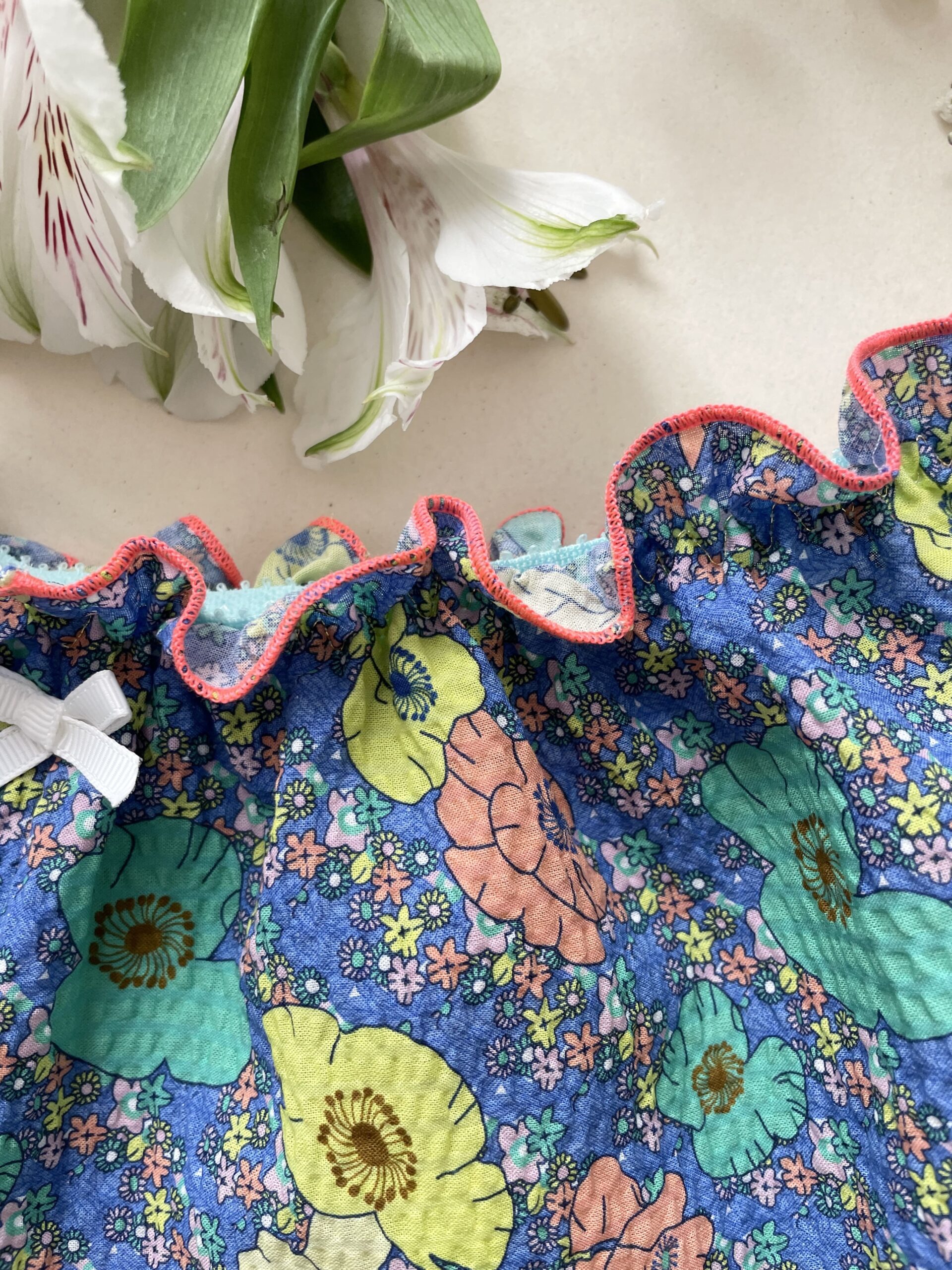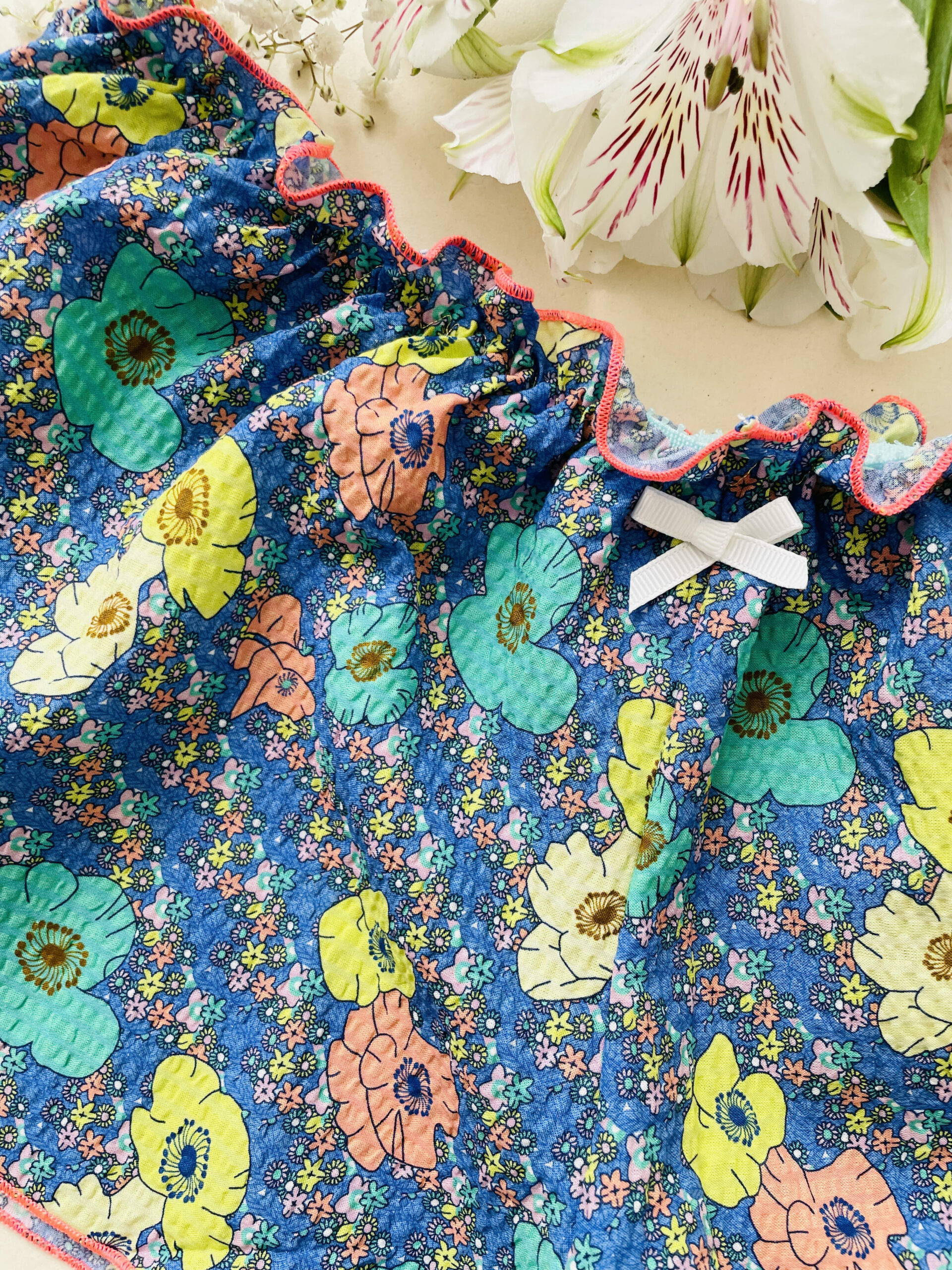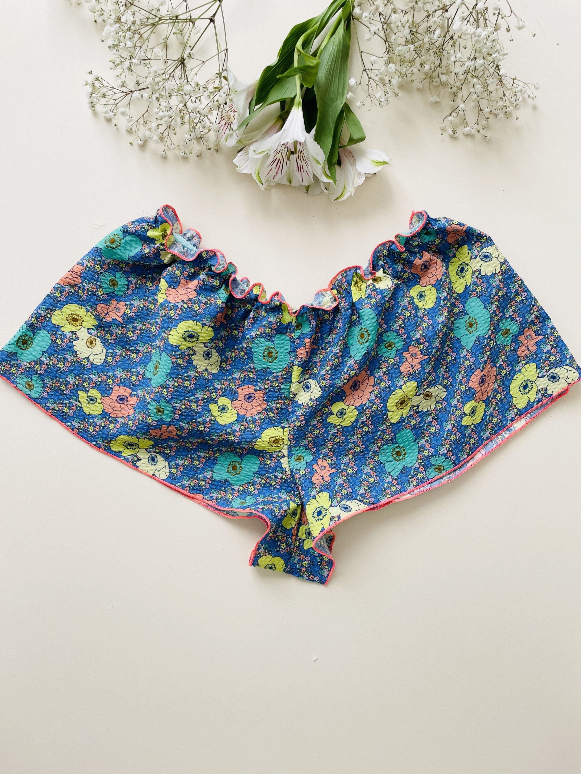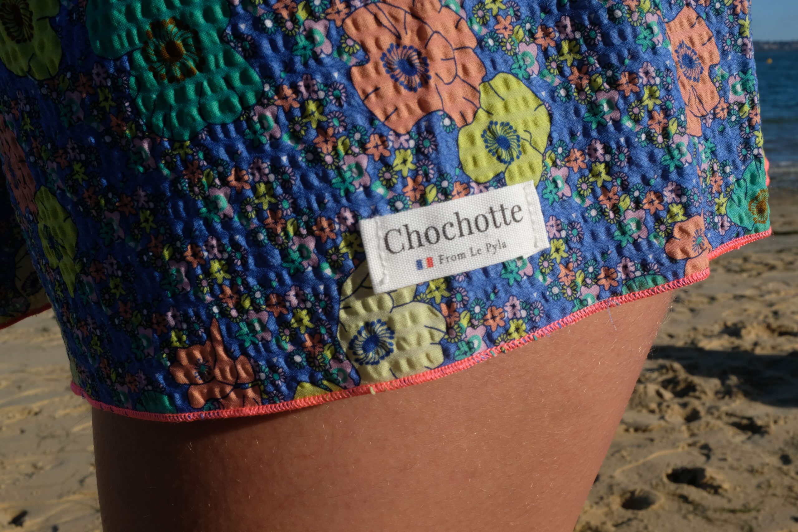 Shorty pour femme avec de jolis froufrous à la ceinture 100% coton seersucker, certifié Oeko-tex, 100% confectionné par mes soins avec amour au bord du Bassin d’Arcachon.